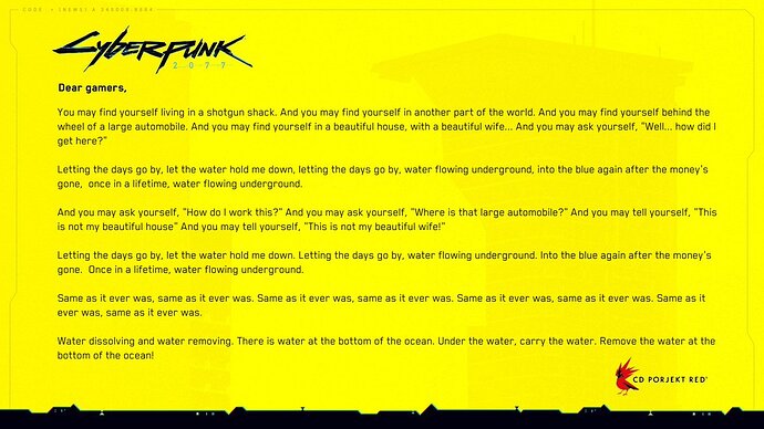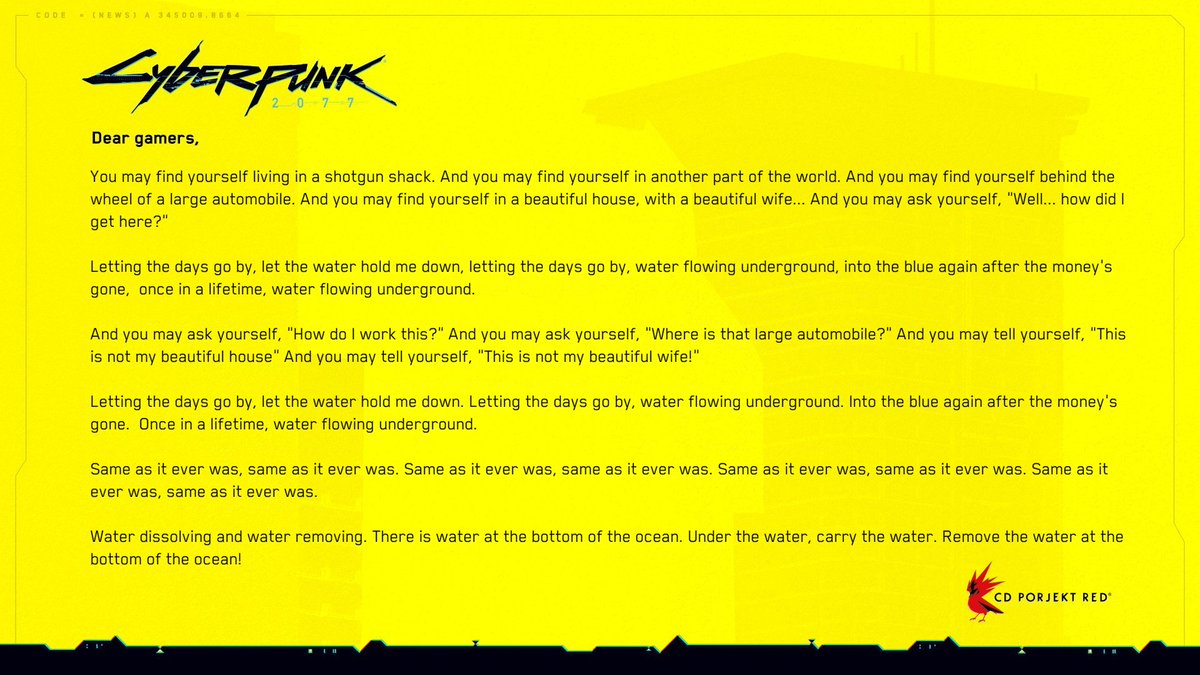 It seems that Cyberpunk 2077 itself has some references to Talking Heads songs in it which is probably why somebody made the connection