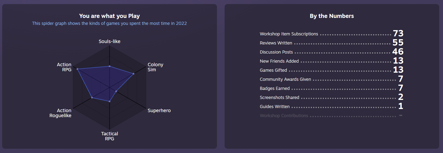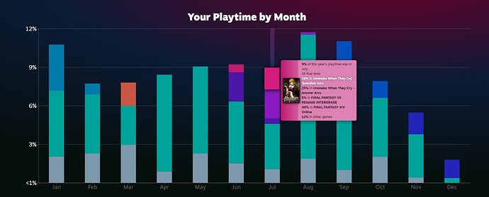 I couldn’t figure out an easily shareable thing so deal with this off kilter screenshot. The amount of random PC stuff I get to via itch sorta made this an unrepresentative sample, but I like that I played more demos than new games. Also impressed that I spent that much time on Globesweeper as I really just wanted that to clear that one giant puzzle as it is ridiculously tricky to do so and even with a save state every 1000 correctly marked mines (yes it is cheating, but a checkpoint every 45 minutes or so without a mistake seemed like a fair thing to make exist) it still took seemingly a ton of time to actually pull off.