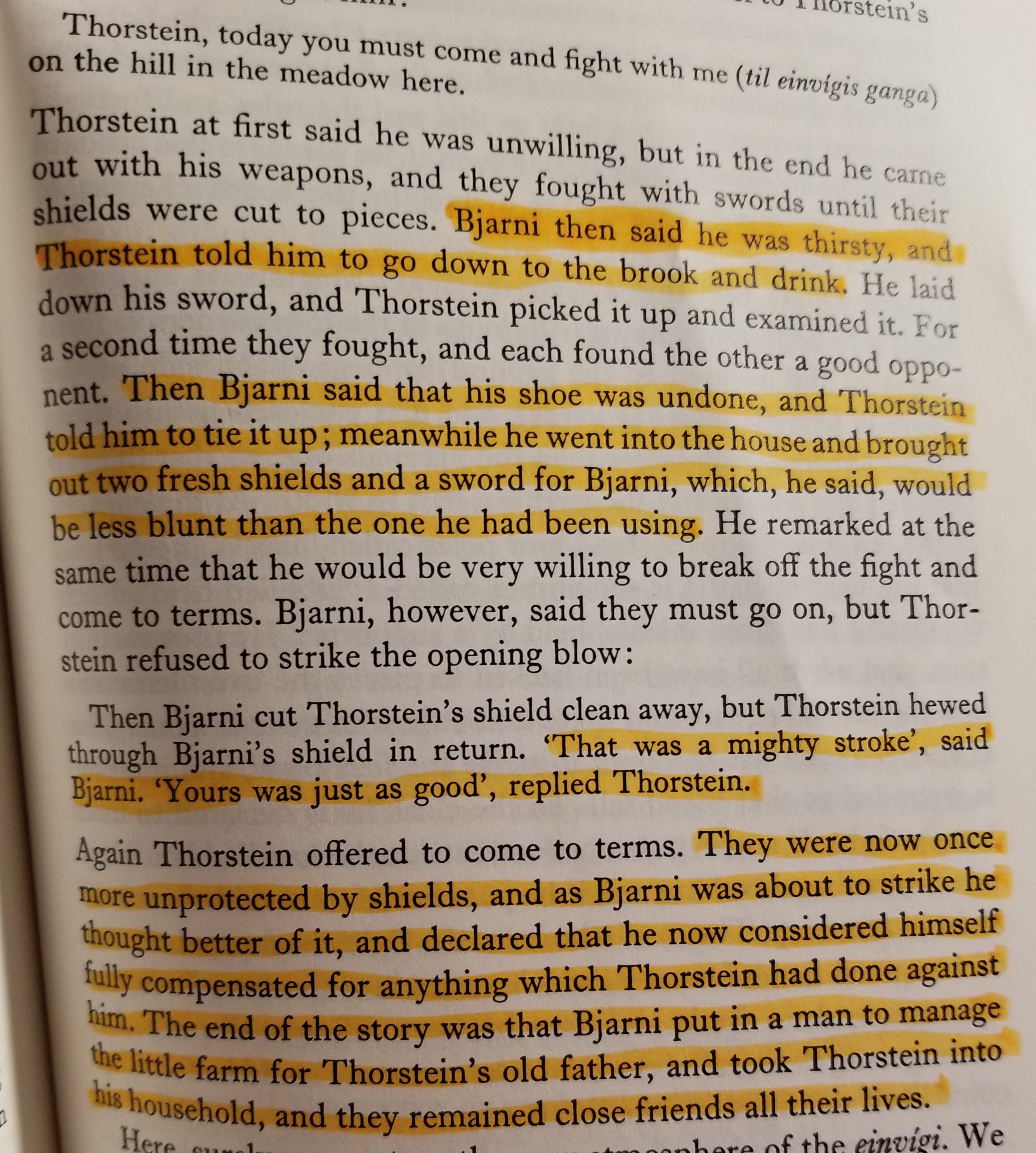 I believe holmganga rules were something like “it ends when blood shows on the cloak they’re fighting on.” A good solid hit and you’re maimed or dead. People are often depicted as becoming much less eager to defend their honor or push for redress of X slight as soon as their shield is broken, because without the shield their chances of avoiding that good solid hit go down exponentially. They also seem ok with letting opponents refresh weapons/shields even under informal conditions. It can sort of leave the impression of people who’d really rather not kill one another if they don’t have to but gosh, this is their legal recourse, and they’ll be damned if they’ll just walk off when the other guy might get tired of the possibility of impending death/murder first!