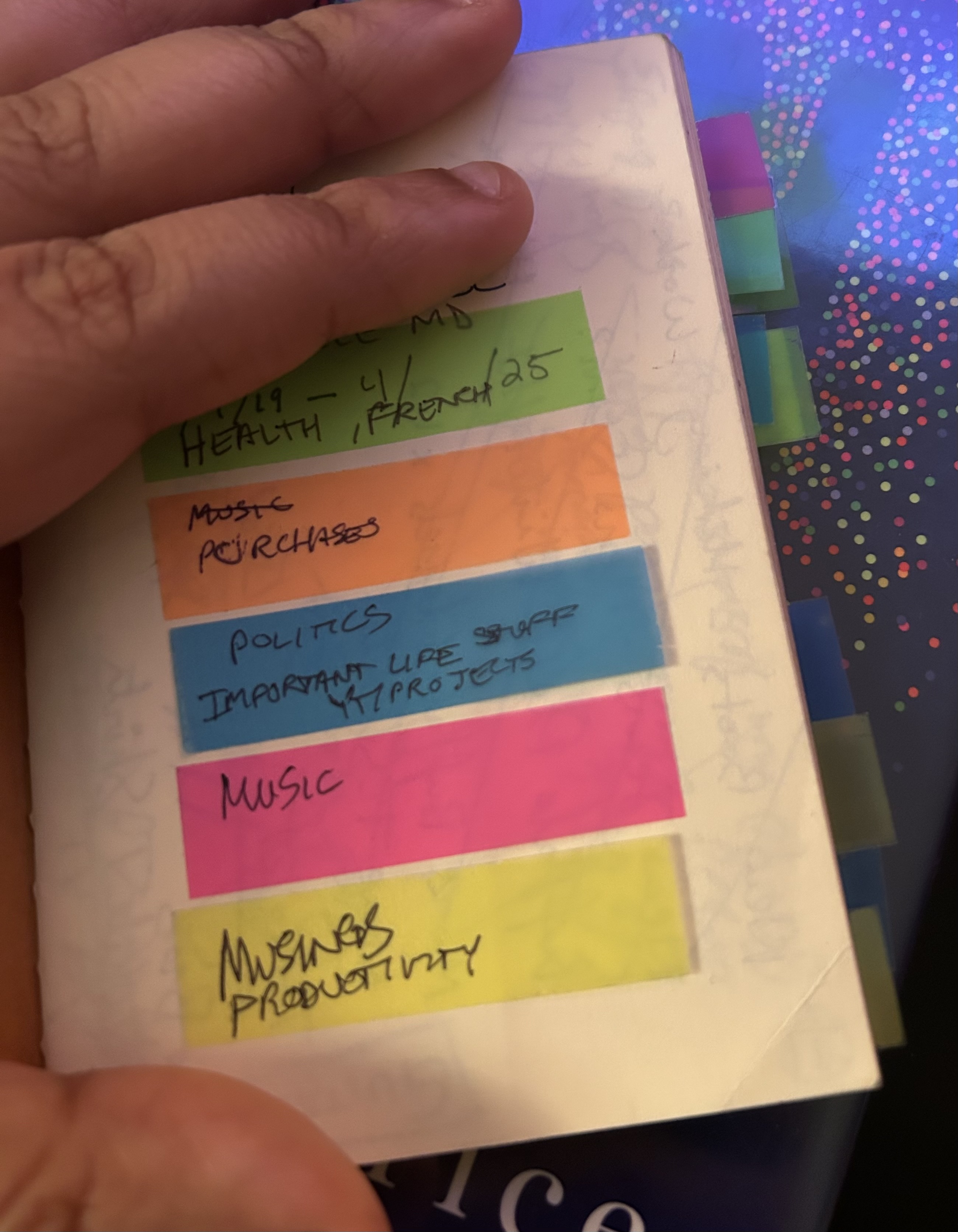 I came up with these tags mostly after I was done with the notebook, one of the reasons I like a small notebook for this, not so intimidating to reread and try and summarize. (apparently Darwin also used this 3x4" size when he was in the Galapagos etc)