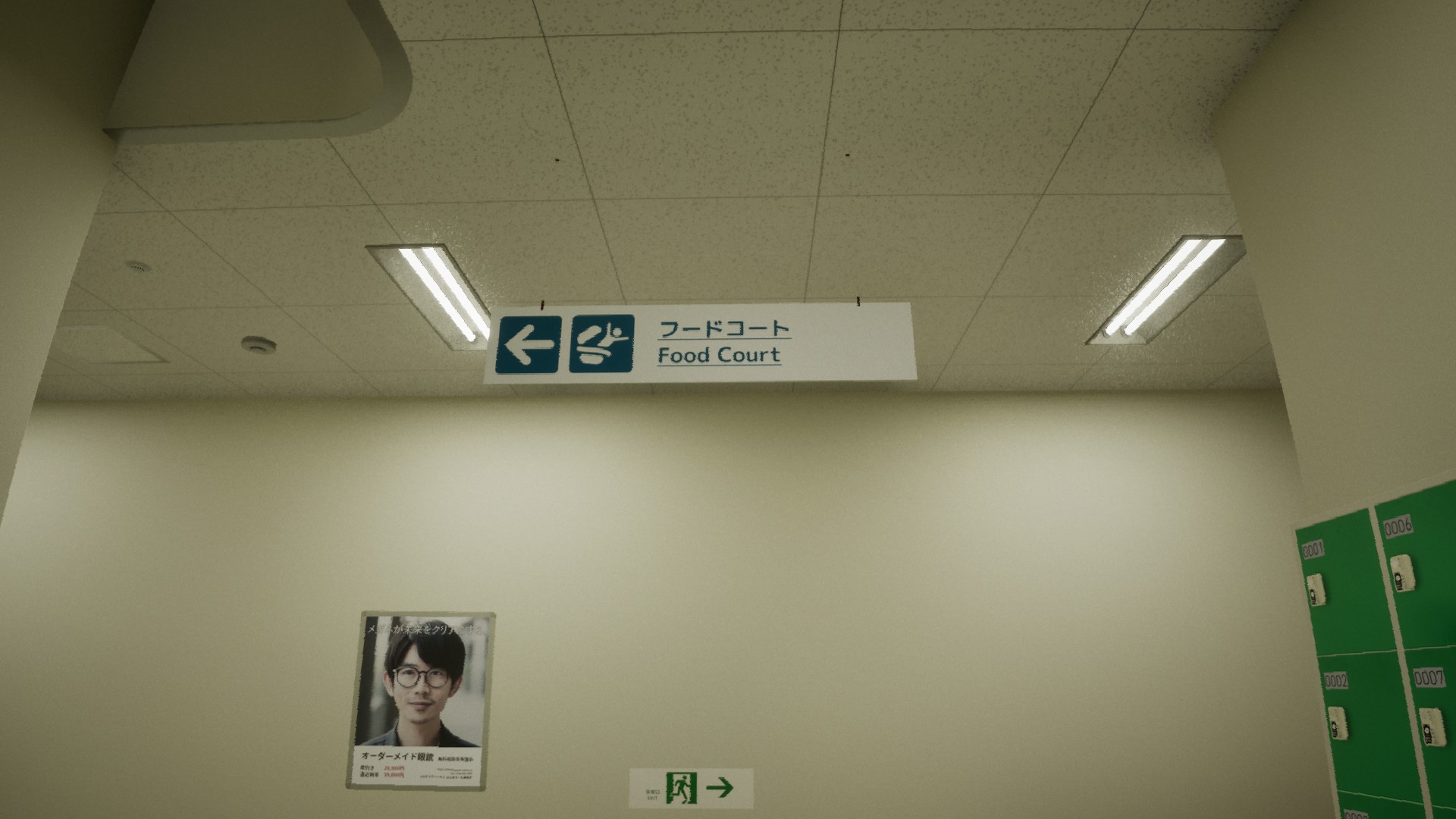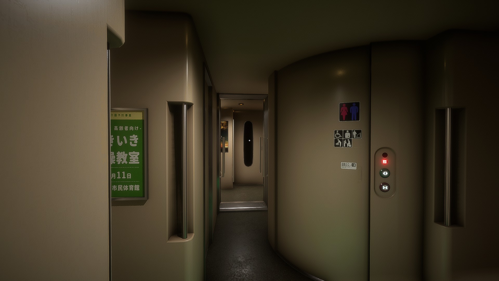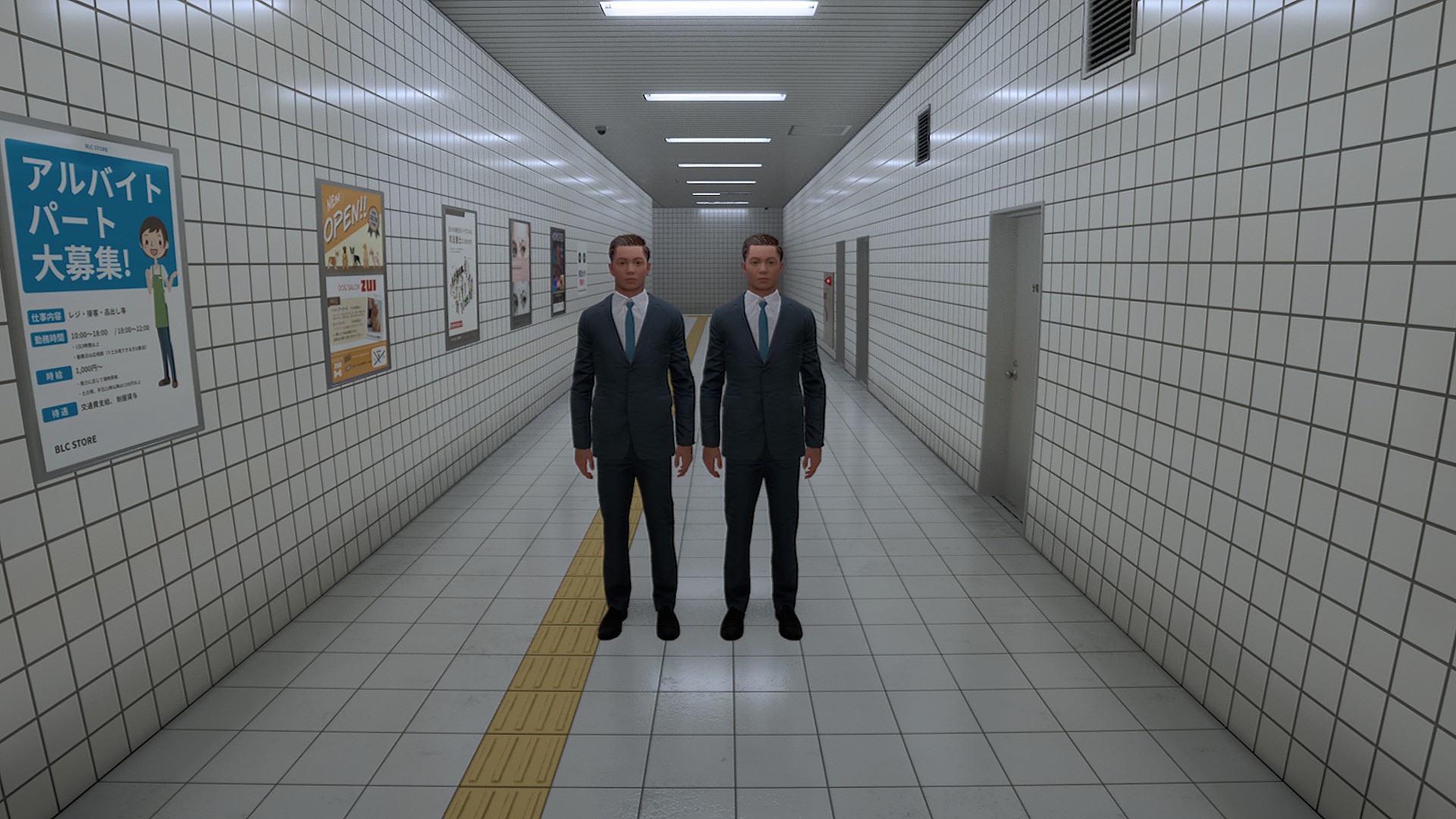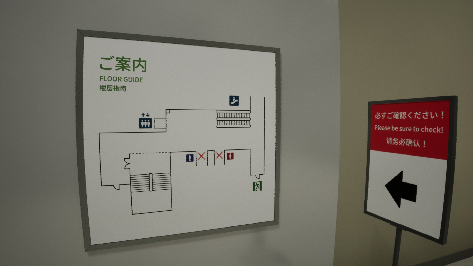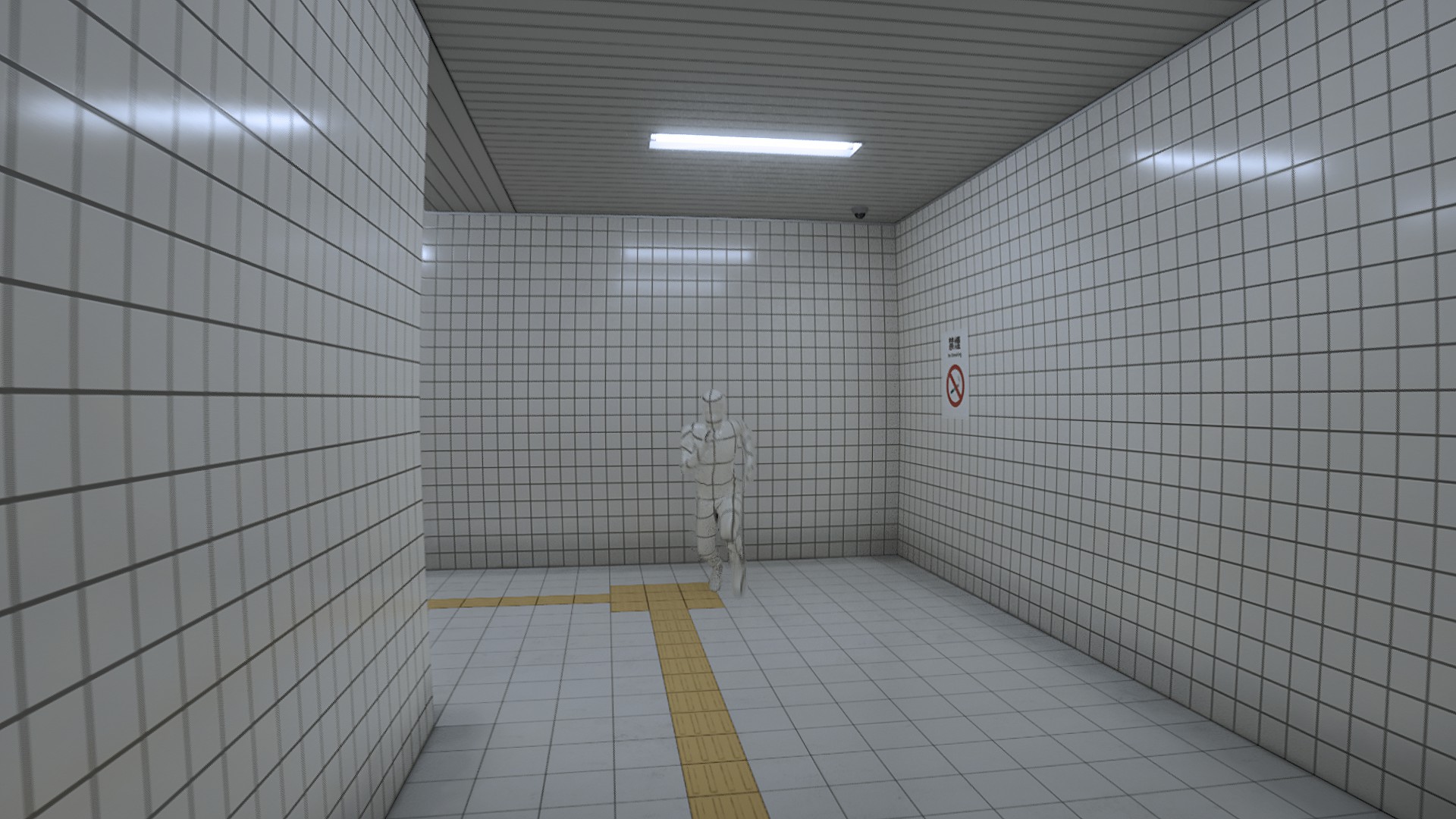 In PT your goal is always to get through the door at the other end of the hallway, sometimes solving a puzzle or avoiding Lisa the Ghost along the way. In The Exit 8 you have more agency, but thankfully it’s reduced from Observation Duty’s “too many options” to a binary: if the hallway looks normal, you walk straight through. If there’s an “anomaly” in the hallway, you turn around and go back the way you came. Whichever direction you go, you end up in the next iteration of the hallway. If your choice was correct, you gain a point – indicated by a sign on the wall, where points are represented by how close you are to “Exit 8”. If your choice was wrong, then you’re reset back to zero points. The theming is a hallway in a subway station. A man is walking the other way down the hallway, and ignores you in most cases. “Anomalies” vary from very obvious things like the tunnel suddenly being flooded with water, or a pair of Japanese businessmen standing in the middle of the hallway, to much more subtle things like the posters on the wall slowly growing, or the normal maps on some of the floor tiles being replaced by spooky faces. In the majority of cases, you’ll either see something wrong and turn around, or you won’t see anything wrong and keep going, hoping that the points sign will be incremented rather than reset to zero. In a few cases, you get “caught” by something and the screen goes white, and then you’re back at the sign and it’s reset to zero. Once you successfully pass each anomaly, it will no longer appear, but if you fail to identify an anomaly it will get shuffled back into the list of hallways.