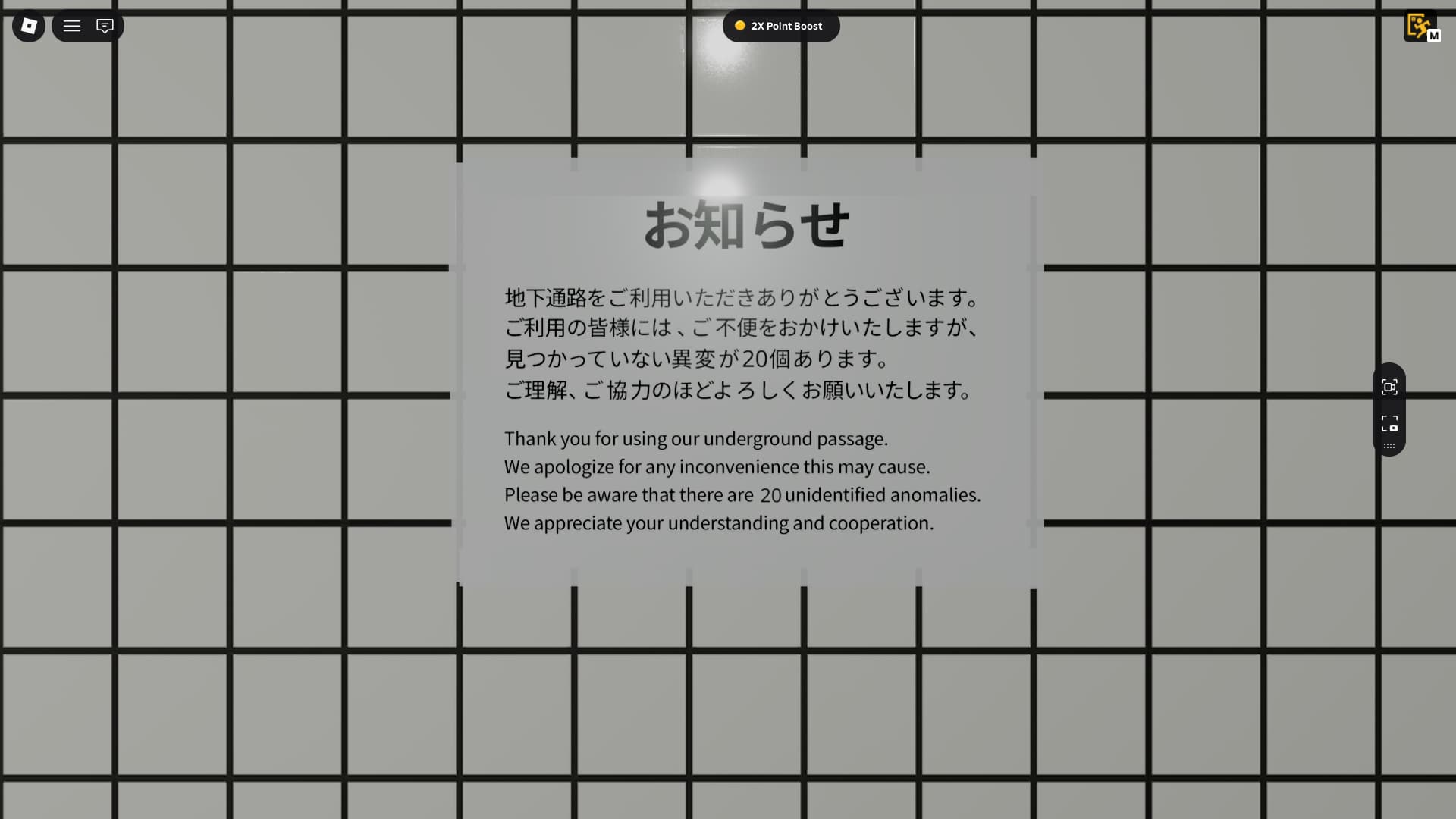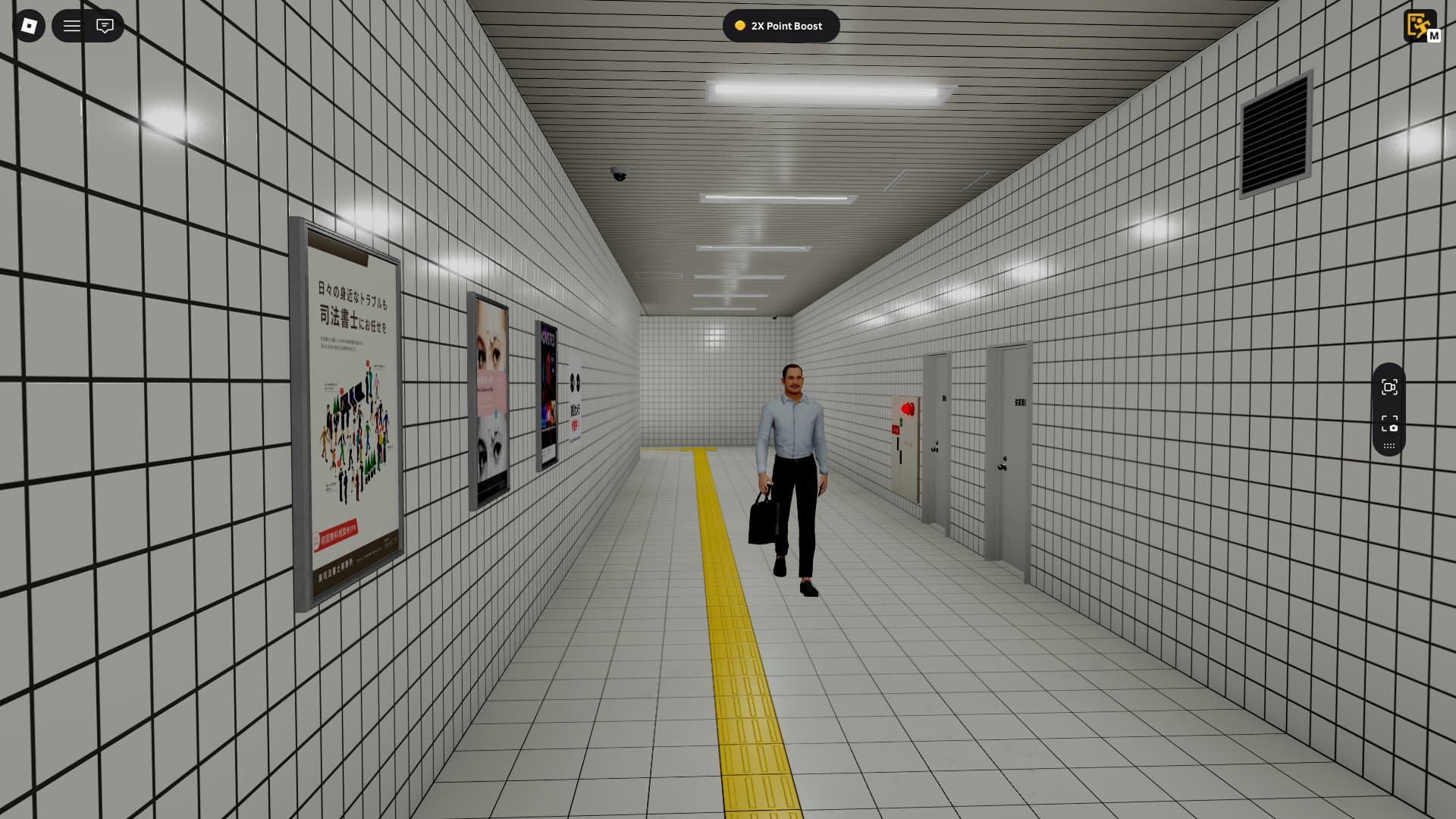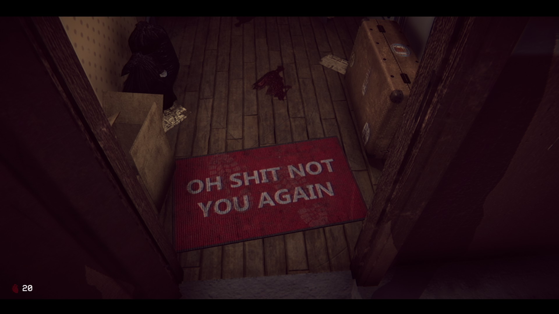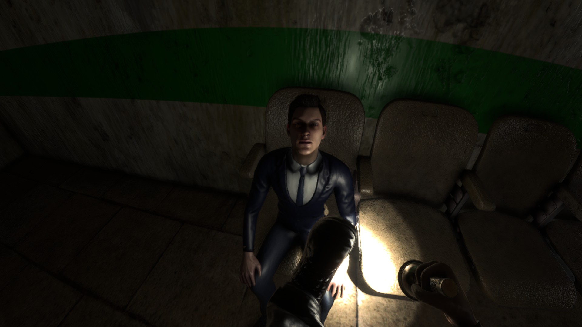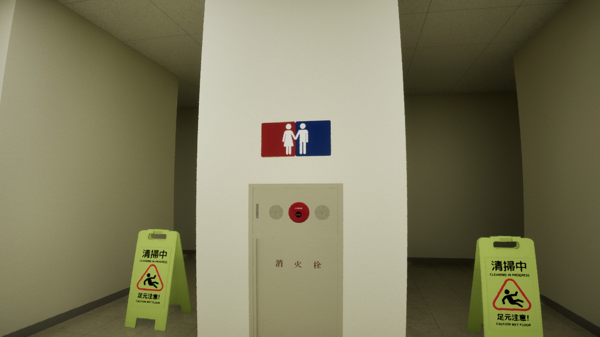 In PT your goal is always to get through the door at the other end of the hallway, sometimes solving a puzzle or avoiding Lisa the Ghost along the way. In The Exit 8 you have more agency, but thankfully it’s reduced from Observation Duty’s “too many options” to a binary: if the hallway looks normal, you walk straight through. If there’s an “anomaly” in the hallway, you turn around and go back the way you came. Whichever direction you go, you end up in the next iteration of the hallway. If your choice was correct, you gain a point – indicated by a sign on the wall, where points are represented by how close you are to “Exit 8”. If your choice was wrong, then you’re reset back to zero points. The theming is a hallway in a subway station. A man is walking the other way down the hallway, and ignores you in most cases. “Anomalies” vary from very obvious things like the tunnel suddenly being flooded with water, or a pair of Japanese businessmen standing in the middle of the hallway, to much more subtle things like the posters on the wall slowly growing, or the normal maps on some of the floor tiles being replaced by spooky faces. In the majority of cases, you’ll either see something wrong and turn around, or you won’t see anything wrong and keep going, hoping that the points sign will be incremented rather than reset to zero. In a few cases, you get “caught” by something and the screen goes white, and then you’re back at the sign and it’s reset to zero. Once you successfully pass each anomaly, it will no longer appear, but if you fail to identify an anomaly it will get shuffled back into the list of hallways.