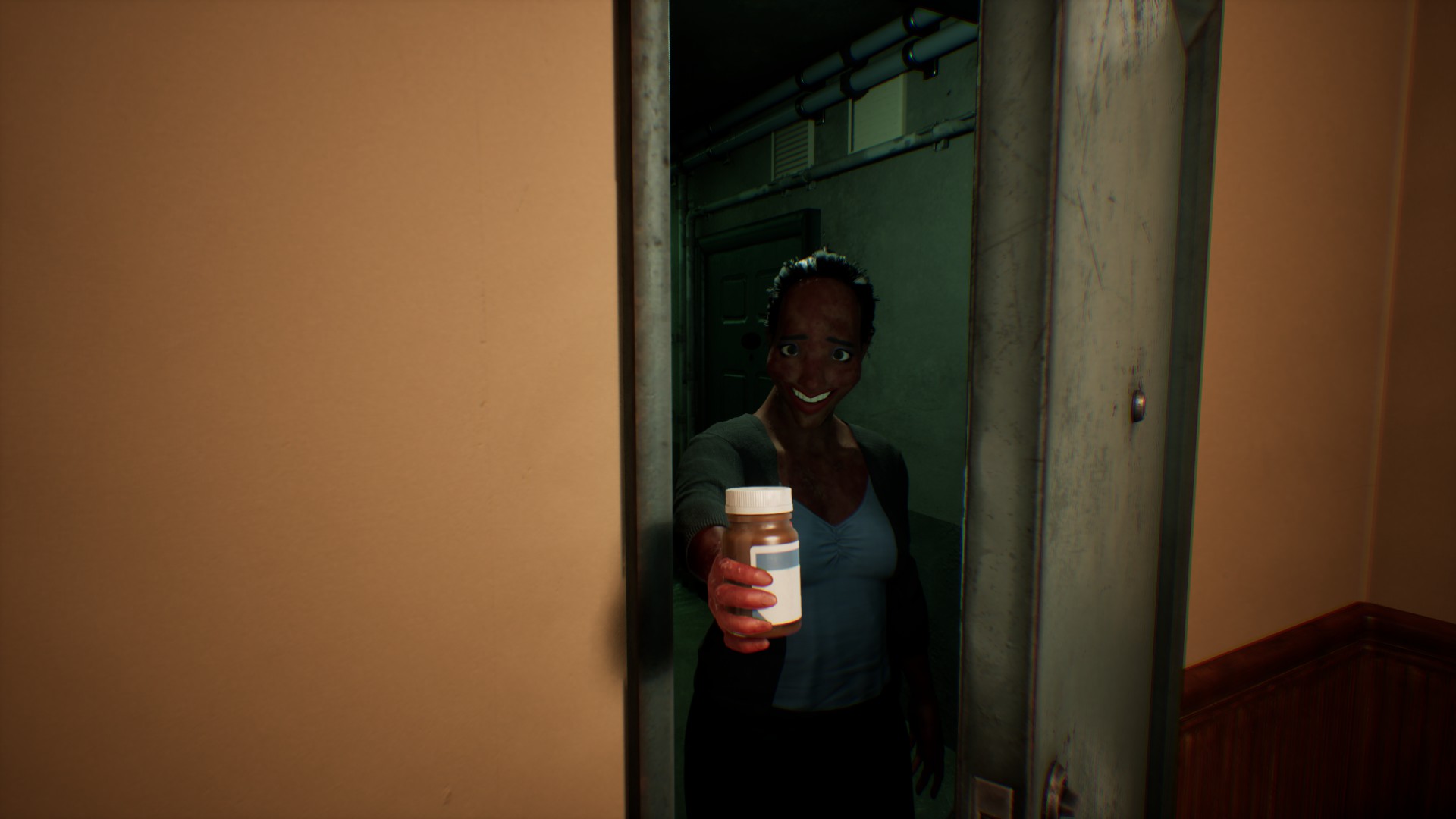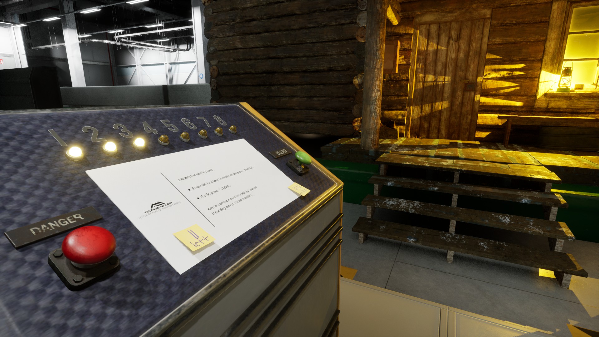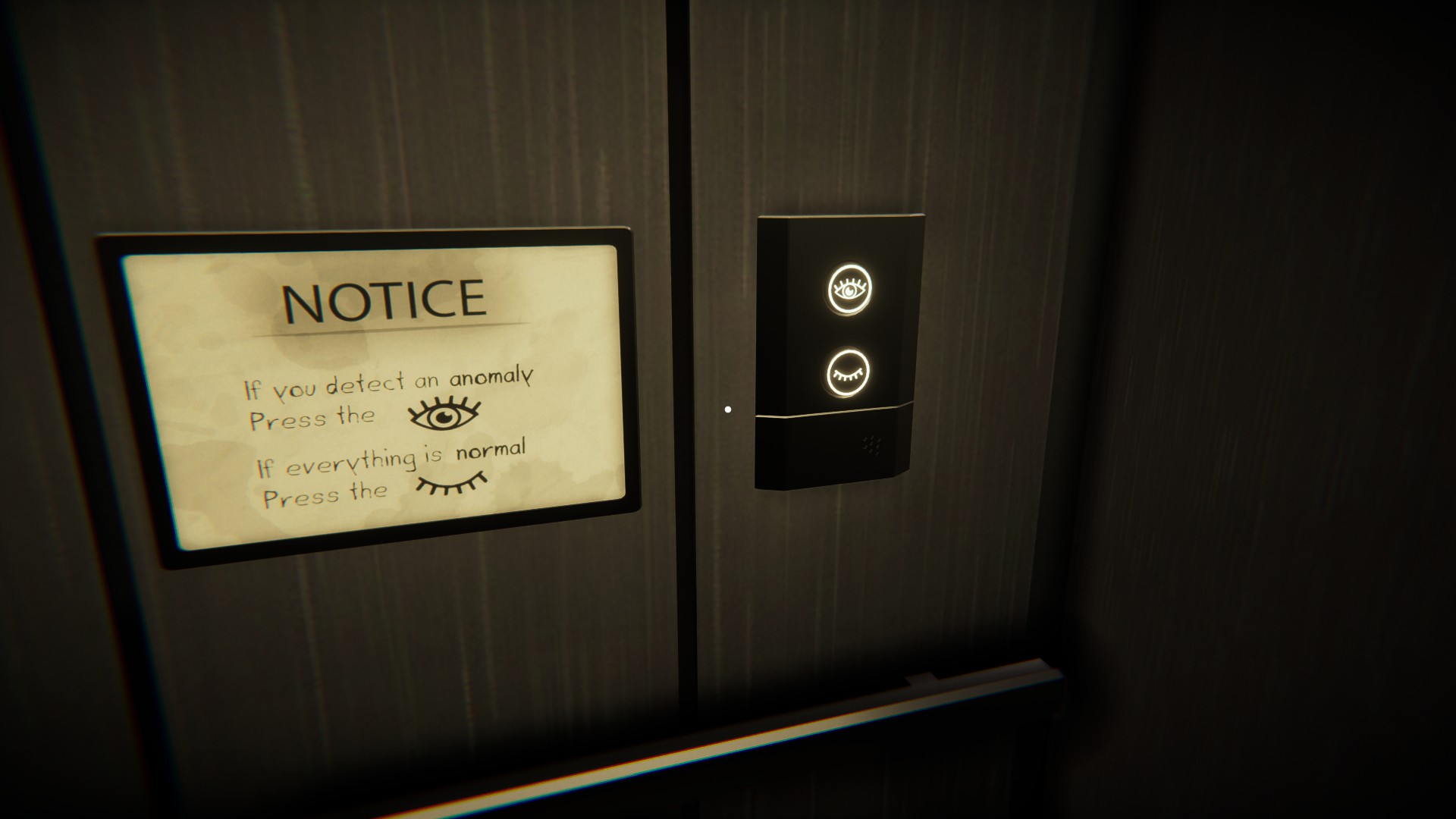 As usual, you get the normal ending at 8 points, and then it tells you how many anomalies are left, and then you finish all those and get the true ending. Rather than walking down a repeating hallway, each area is a structurally-identical cabin that comes down a giant conveyer belt, and you mark a cabin good or bad via buttons on a control panel near the front door of the cabin (using an interact button, although this is the only place in the game where you use the button). Points are indicated by lights on the control panel, and the number of remaining anomalies is on a sticky note on the control panel.