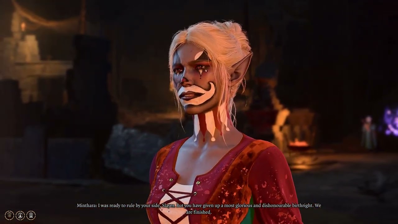 The best thing is they fucked up the flag too, so even though she dramatically breaks up with you here you can still go back to camp and fuck immediately. It would be fine if there was a convo where you could explain your reasons to her, like the epilogue they replaced (?) where you explain to Minthara that you rejected Bhaal to be free of his influence and she understands entirely based on her experience with the absolute, but there isn’t, so instead it just doesn’t make any sense really. The 4 dialogue options they give you in this convo are so completely bitchmade it’s hilarious