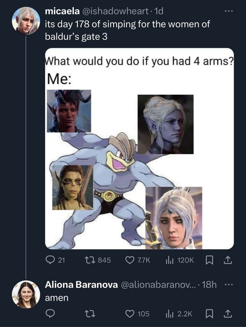 My friend was telling me about how the motion capture director for this game originally tried out for shadowheart, when she saw the gal who got the part instead she was like oh so this is who they got huh and was prepared to hate her but as they recorded the performance she was like damn this bitch is good, and beautiful, and now they’re dating. the more you find out about this the weirder it becomes. woman is going through it…bioware magic real. they done brought it back to the world…