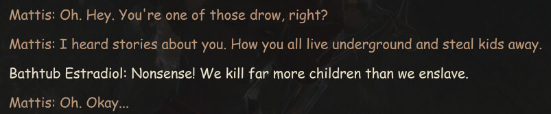 You are right, but regardless having the-grinch-cosplaying-as-cheryl-hines constantly growling about how much I stink and how bad she wants a taste (to be fair my duergar DOES look and act like he smells like a bog) is about my limit, as opposed to whatever weird shit Gale was doing giving me bedroom eyes and talking about “sharing his weave” as a pretense to getting in my platemail jorts.