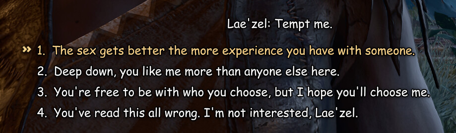 Honestly I know that picking a boyfriend/girlfriend in these games is something a lot of people take seriously but unless it’s some crazy alien sex thing played (I think) for laughs like La’zael I never want to engage with a video game romance system ever again.