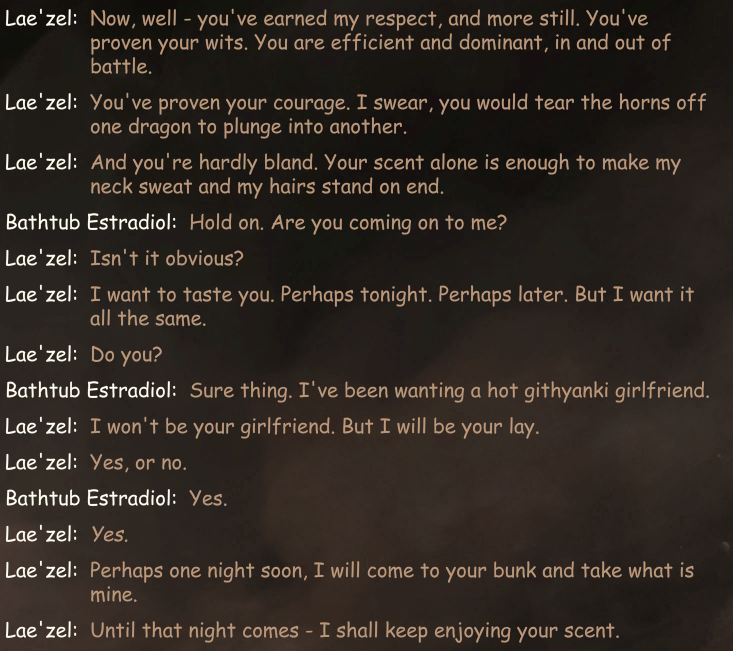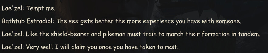 I was dying last night because we killed everyone in the grove and lae’zel was like yo I can smell your pussy, she kept talking about my “moisture”, go get fucked by minthara and report back and then literally the most pornographic sex scene ive seen in a crpg started playing.