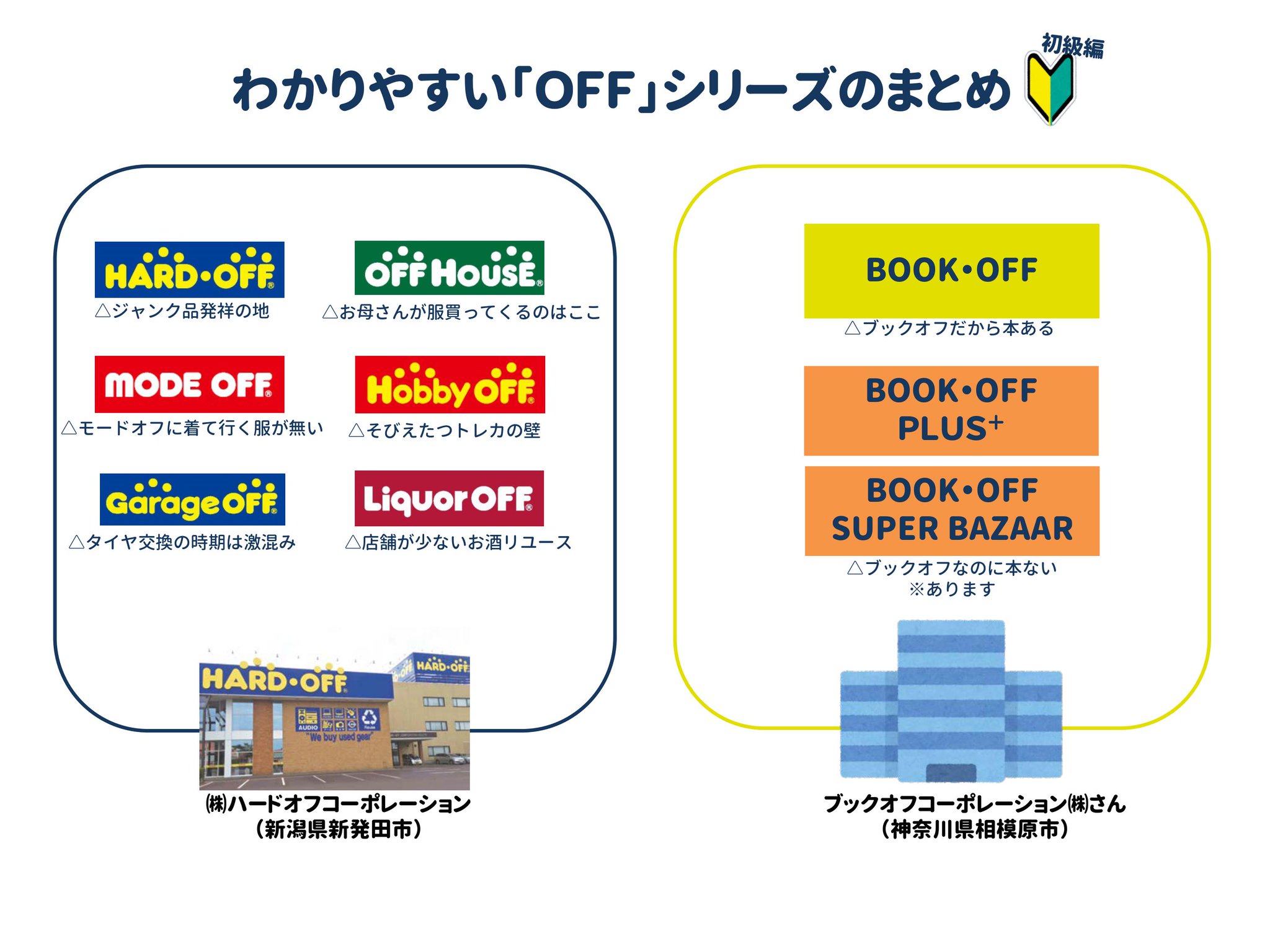 HobbyOff is usually paired with OffHouse. OffHouse is used clothes and furniture and housewares. HobbyOff is gundams and anime CDs and yugioh cards and video games.