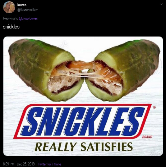 snickles would be dope. i already hollow out my huge pickles with a straw and suck out the guts, WHY NOT fill it back up with delicious peanut, caramel, and nougat