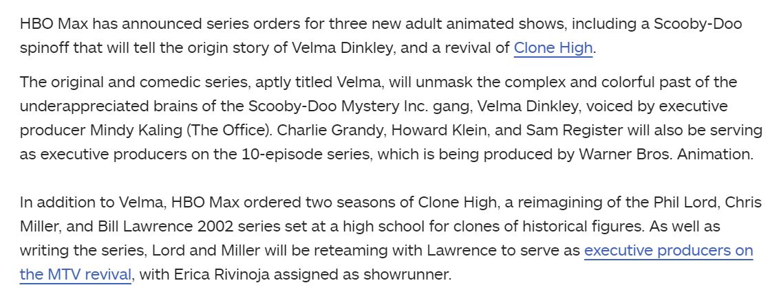 two seasons of the clone high reboot and an adult velma dinkley cartoon seem…fine but i still honestly just want hbo to just do a final season of venture bros tbh