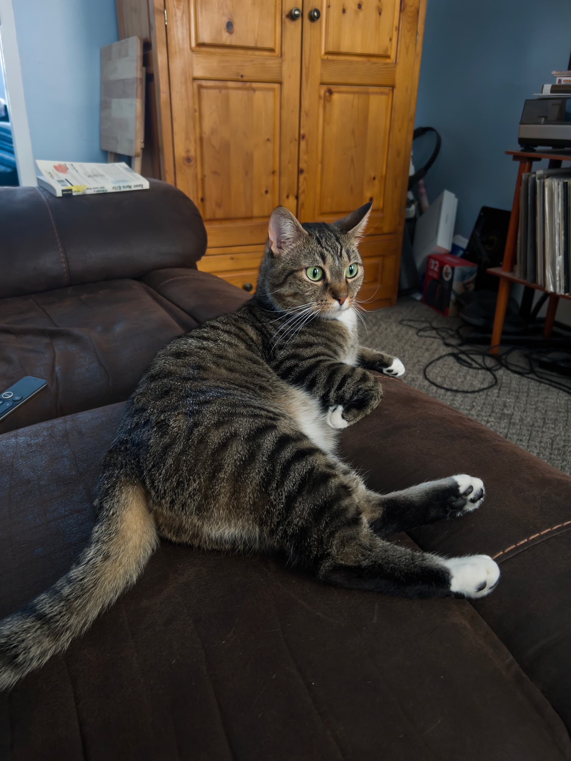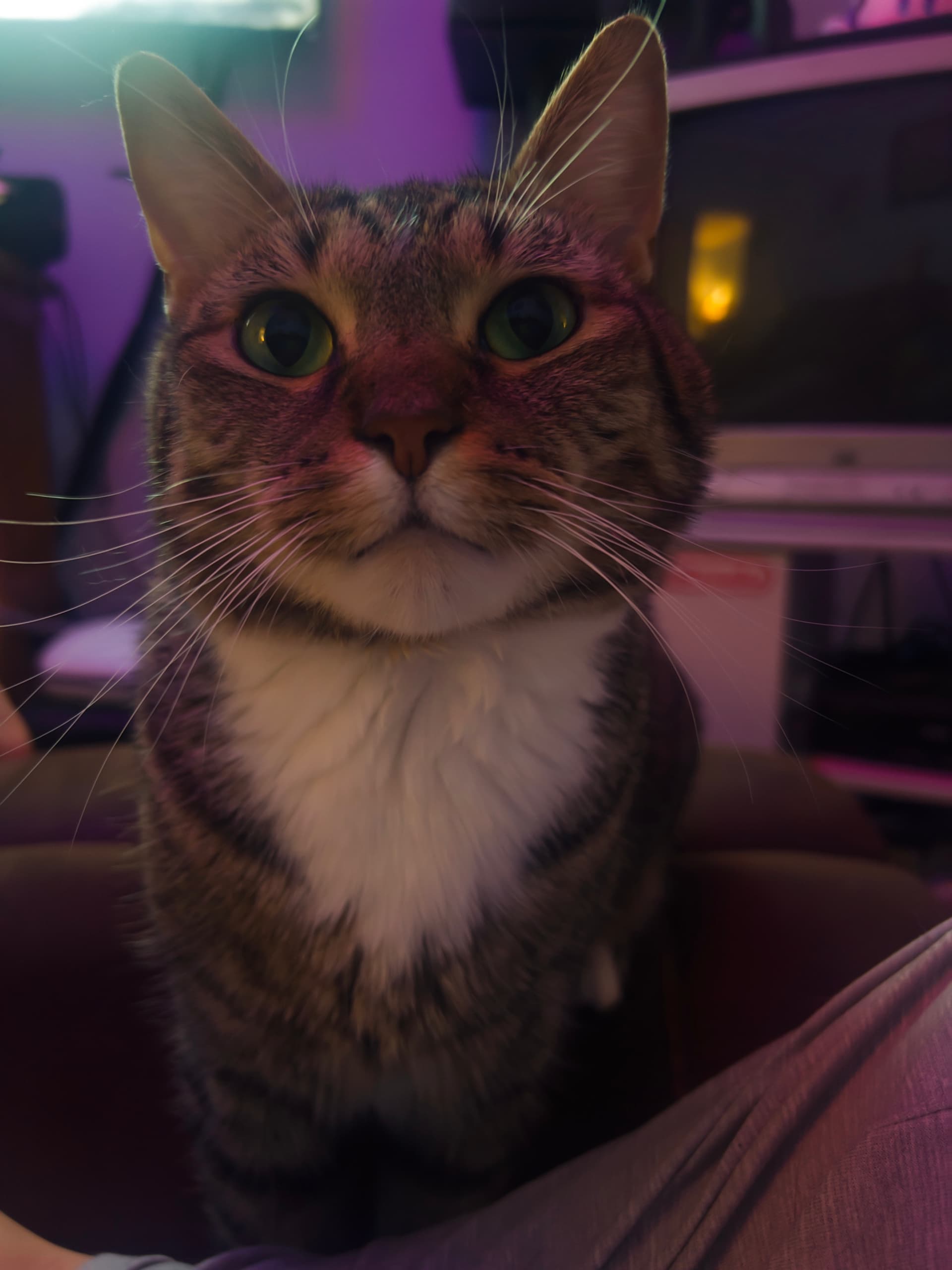 usually when I get up before daphny zaku will gently tap me on the thigh so I know she wants me to put her in my lap so I can scratch her cheeks and rub my knuckles hard against them (she loves this so much!!)