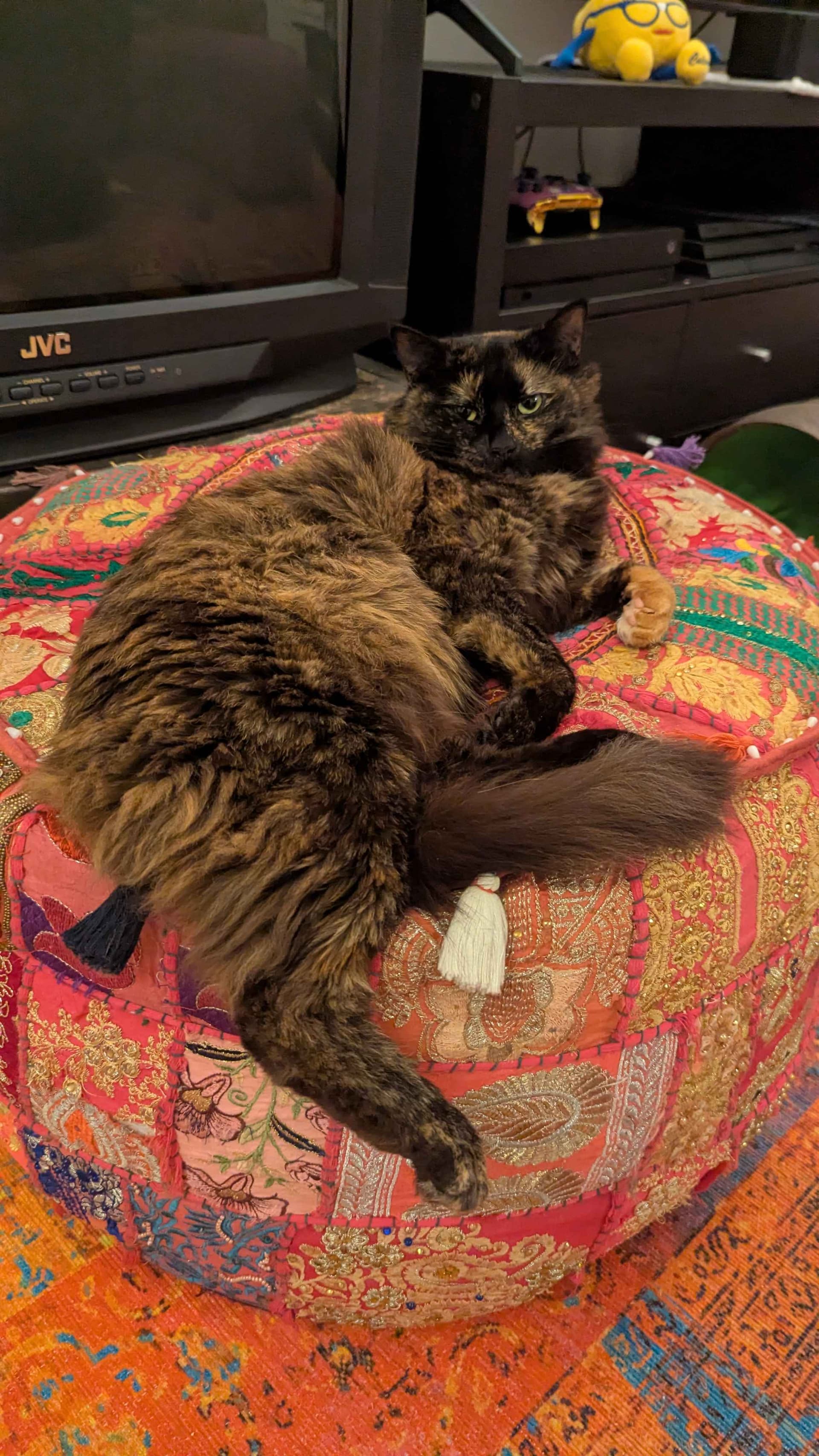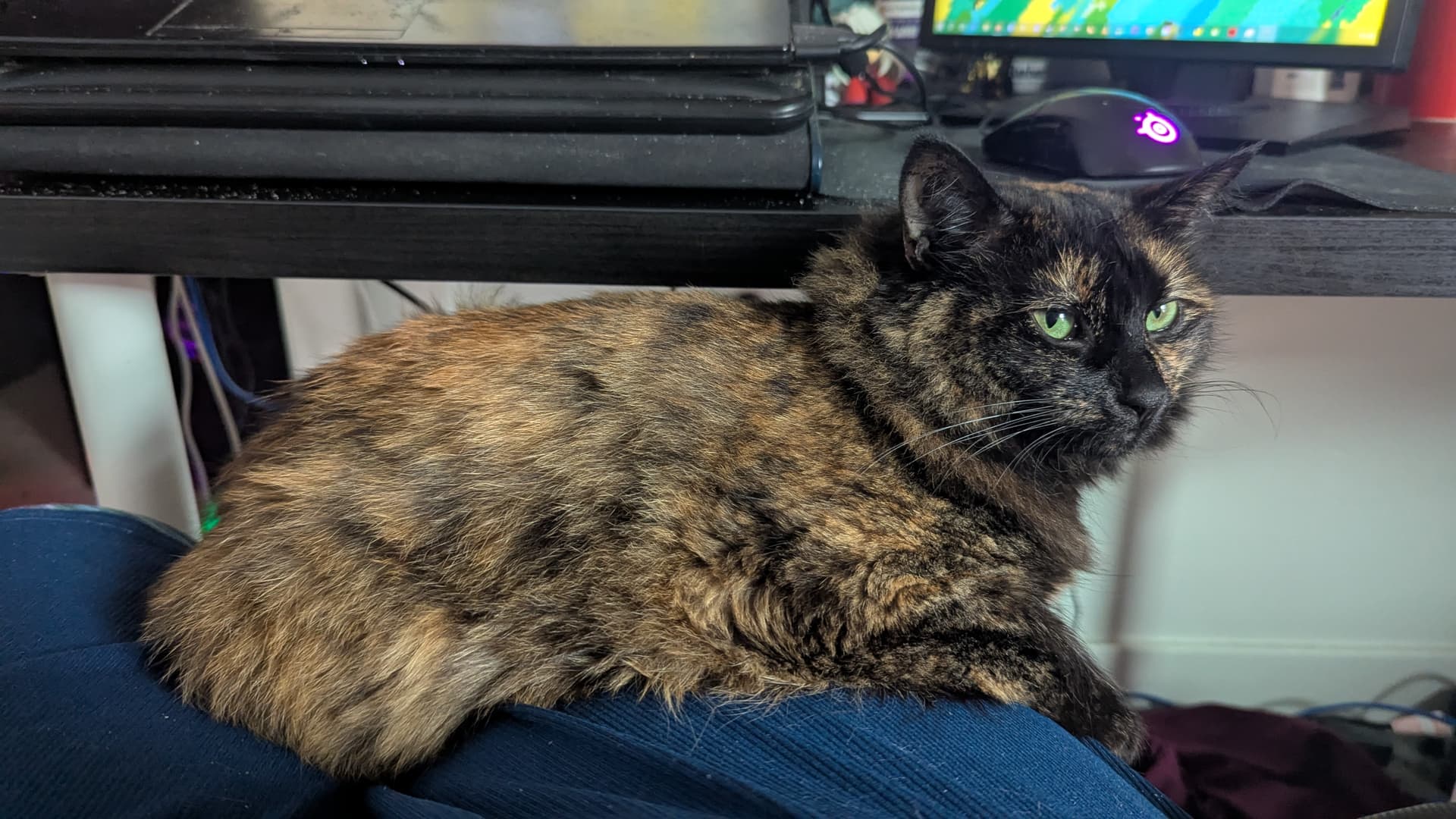 then of course shes an idiot and she gets so into it that she just falls off my lap onto the floor because she has to sit precariously no matter what (she will adjust herself to be positioned precariously again if i move her!!!) and gets annoyed at me for trying to catch her