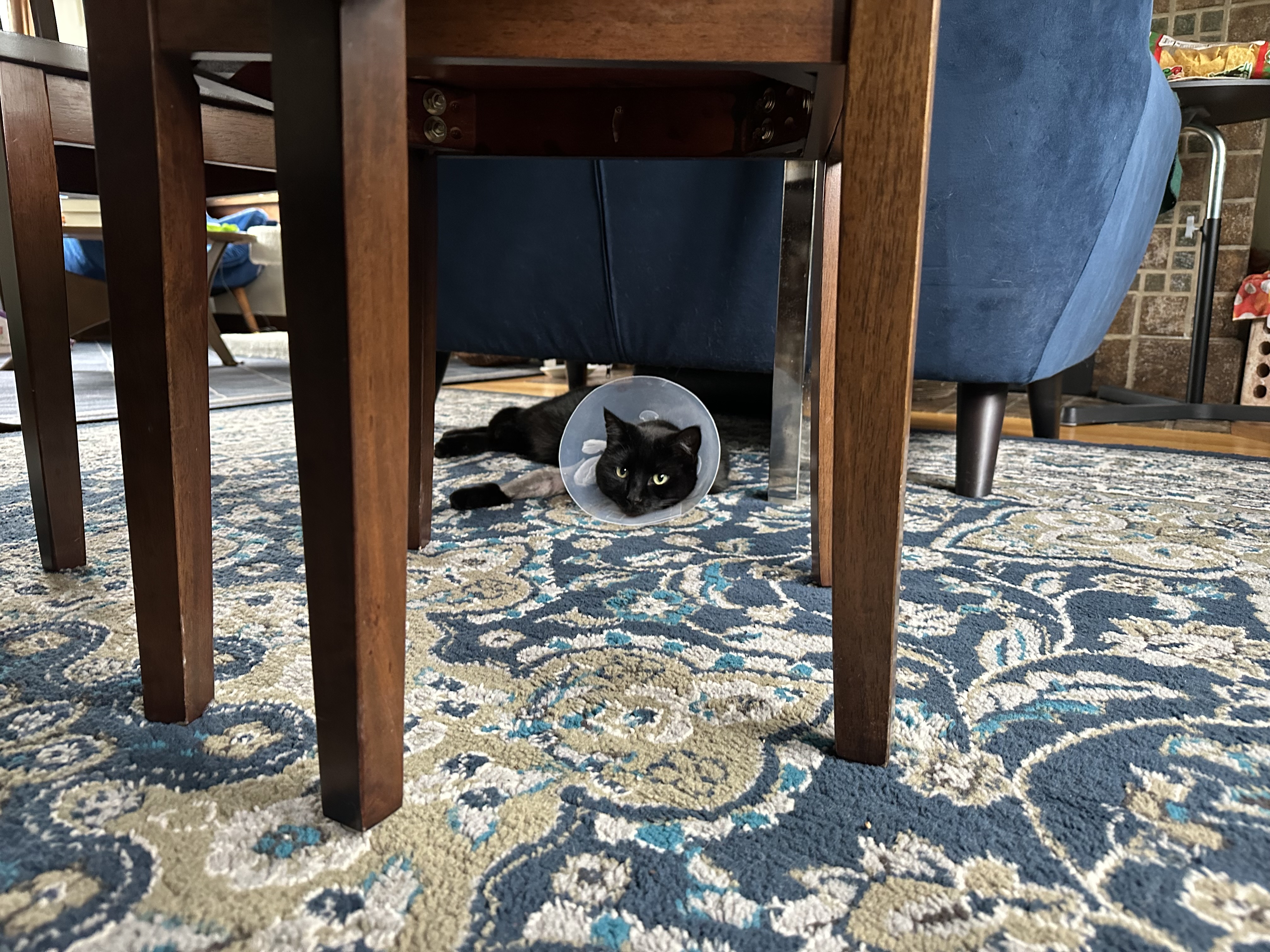Trying not to completely spiral because on top of everything else going on, John went from normal romping around this morning to suddenly throwing up and straining to pass a bowel movement. He also isn’t interested in food or water and keeps finding places to basically hide away. He’s about 16, but up until a few hours ago he was still spry and other than having lost some weight, seemed like he was in great shape for his age. The last time we had his blood work done a few months ago the vet raved about how it was the best they’d ever seen at his age.