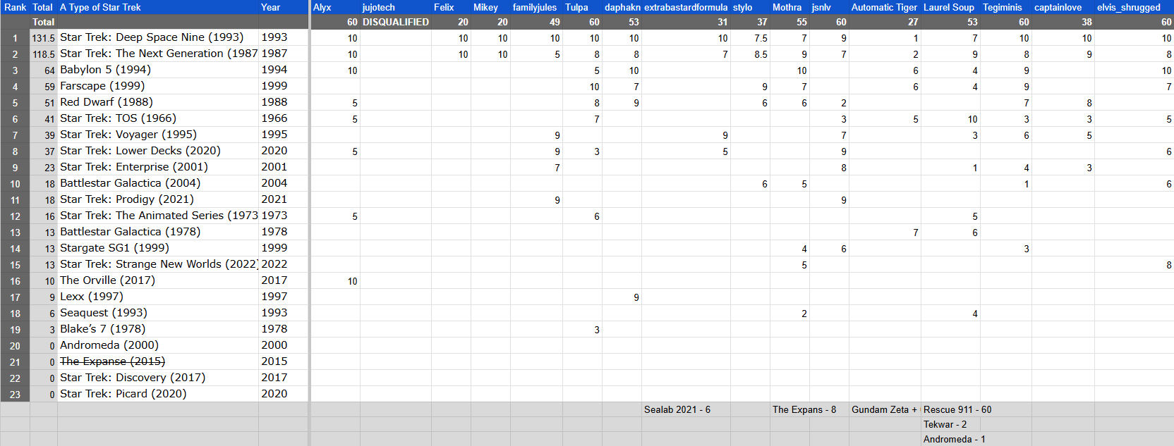 Edit: Actually, I did find a mistake in my tally. Felix and Mikey also gave 10 points each to TNG, but I only counted them for DS9. This didn’t change the final ranking though. Also, the average points used was 45, so 60 was probably too many.