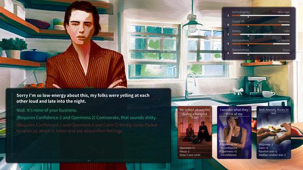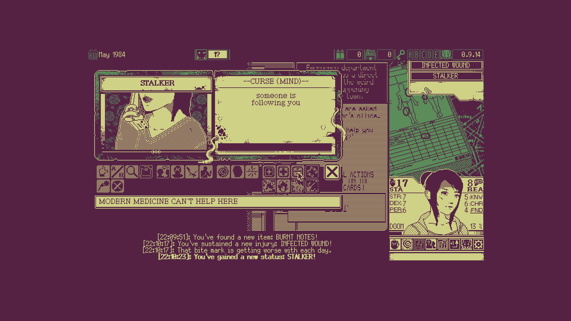 bad things happen to you constantly and your resources are constantly dwindling. i guess it kind of reminds me of king of dragon pass but more of a roguelike. the art is consistently super good! the core of the game being an event system where you basically make blind choices in fucked up situations is very fitting and i like feeling like im gaining some kind of collective occult knowledge by investigating Mysteries and learning how to play the game better. i like how downbeat it is, too. one of my “successful” investigations ended with me having to choose between taking my neighbor to the hospital or cutting out her eye myself to the detriment of my sanity. i never saw her again. so the game makes a really strong impression at the very least, ive only played like an hour of it
