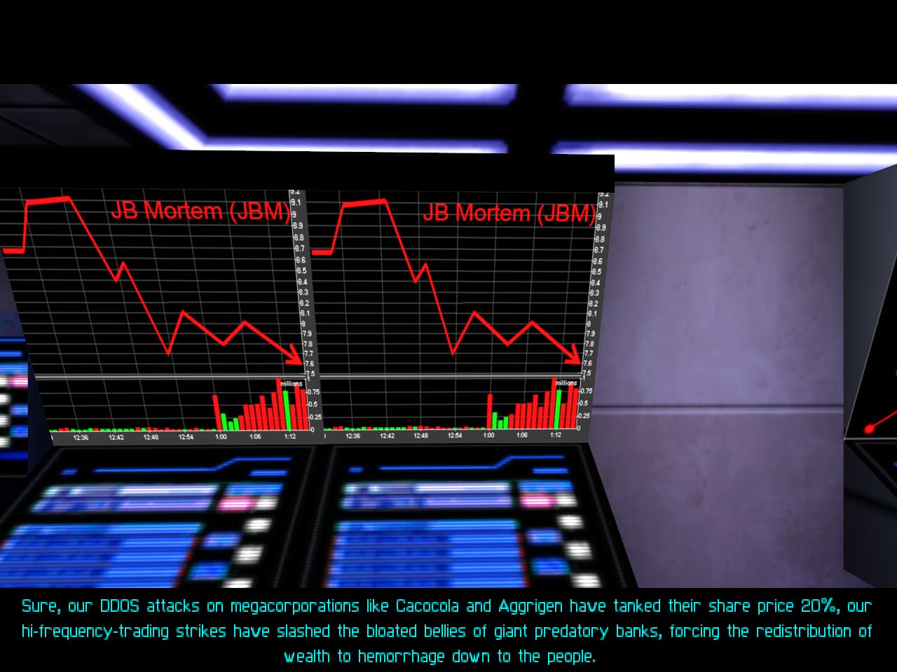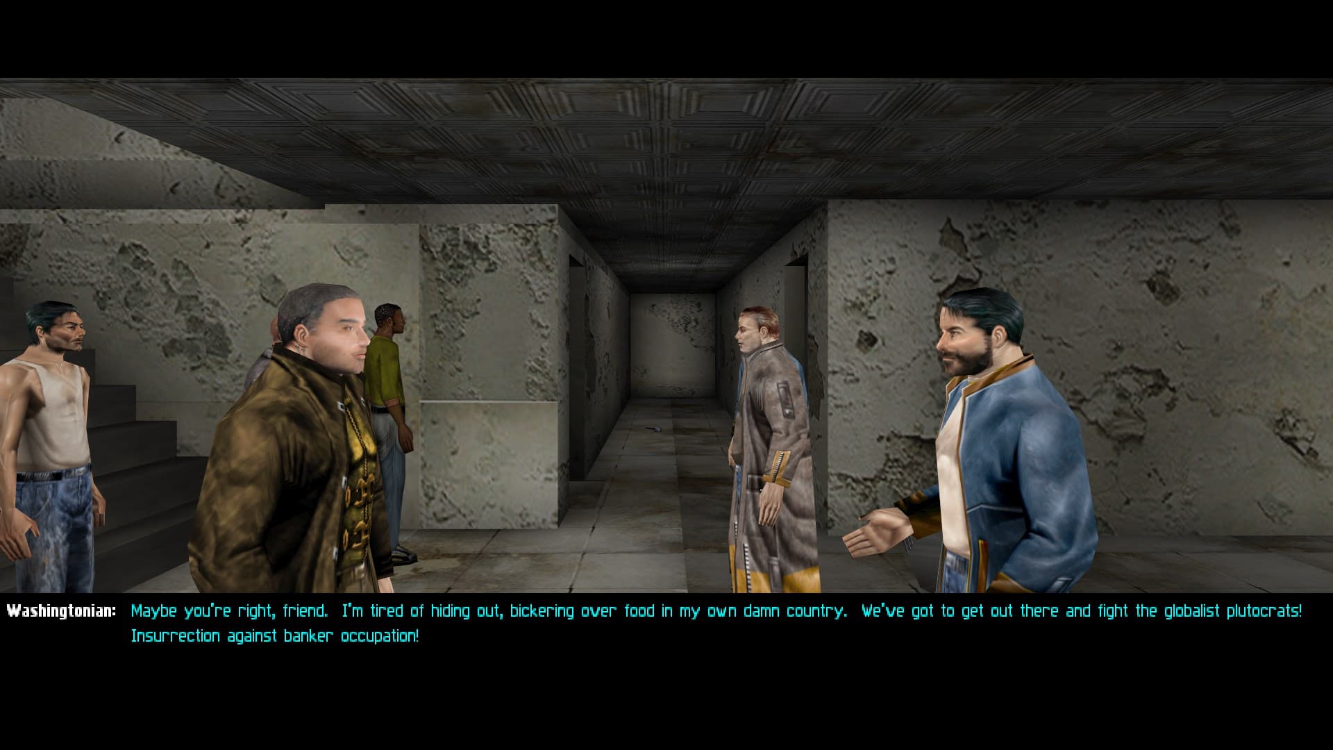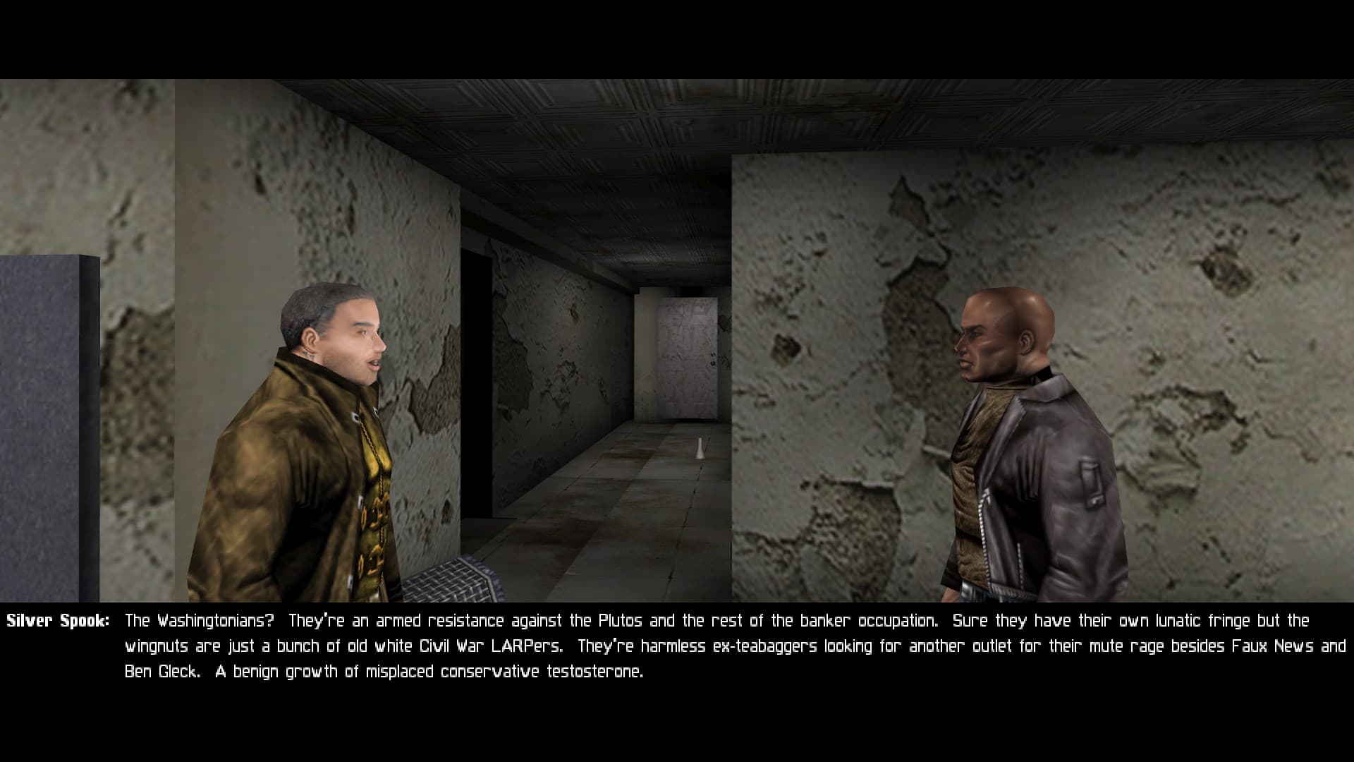 Oh by the way I loved the conversation you can overhear between two parents of an adult child who recently joined up with the MJ12 occupational force in Paris. The dad is like a full liberties patriot who is basically saying that his son is dead to him, while his wife cries that at least in the coming decade when they inevitably cease full control that their son will have a safe life. He retorts that he would rather he die with his family than sign up with the oppressors of liberty for a decent salary. She despairs that the two of them can’t think like that, they can’t abandon their son. You can talk to the dad and get the email and password to a MJ12 terminal up the street, which causes her to say that the husband is going to get their son killed. To this he says something like, he’s an adult. He should know this is the risk when he signed up to play soldier. He He isn’t our son anymore: this week his new friends killed someone for publishing an article in a magazine. Next week he’ll come home to murder us.
