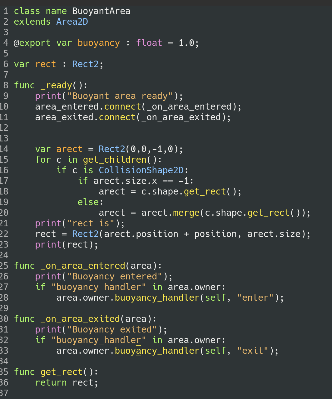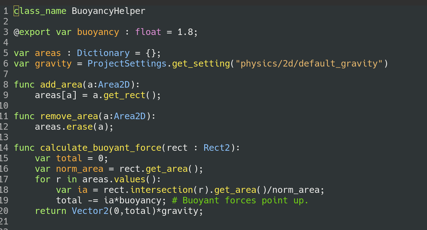 This strategy here is to create a custom Area2D sub-class which notifies objects which enter it that they have entered or exited into a region of Buoyancy. A second helper class, meant to be used on Buoyant objects keeps track of which Buoyant areas an object is currently in and calculates the appropriate Buoyant force based on those regions customizable Buoyancy and the intersecting area. Because of that latter bit objects naturally float at some level on the surface of a buoyant area because the buoyant force is proportional to the submerged area and so approaches zero as the object leaves the area.