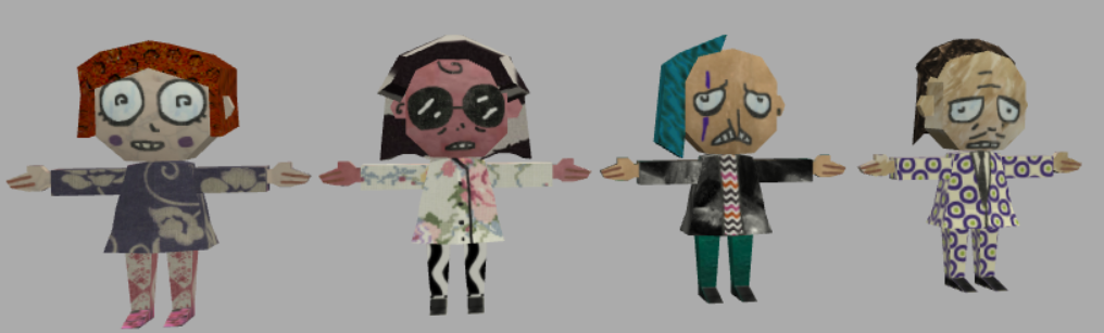I really love these little characters. The Gregory Horror Show influence is shining through. Though the crazy tiling gives the environment this quality that they have entered not a haunted hotel but into the patterns of a Las Vegas casino carpet instead.