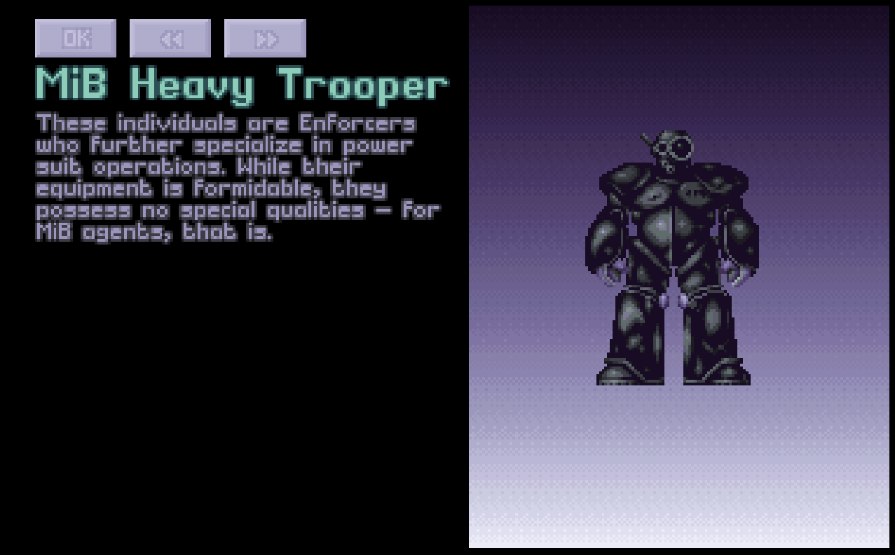 Executors can be ranked as junior officers, but they report to the highest echelons of the Men in Black - or perhaps their employers. They lead small teams of MiB agents in operations against humanity and also possess rare skills. Their bodies are visibly augmented with cybernetics and drugs.