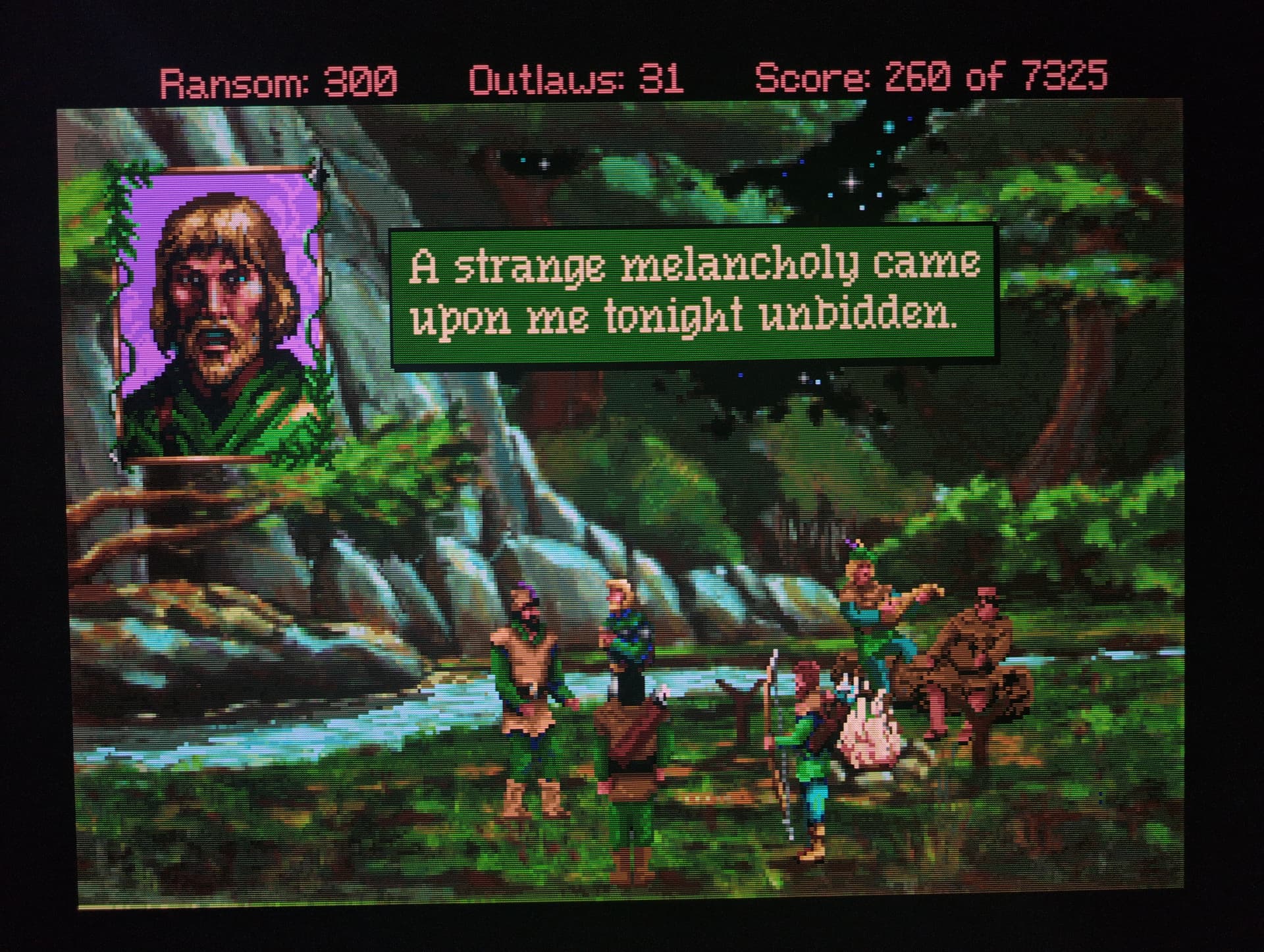 you live the outlaws life in a hideout in the woods commiserating with the fellas every night, in between strikes on the wealthy, or going to the fair. you got a horn you can blow to summon all your pals out of the woods to help you ambush scumbags, or because theres a monk from a secretive militant order who challenges you to a duel who thinks you’re about to ambush him but no, you just want to borrow your buddy little john’s quarterstaff real quick to honorably beat his ass to death with. this is a game of 1991 and forever after