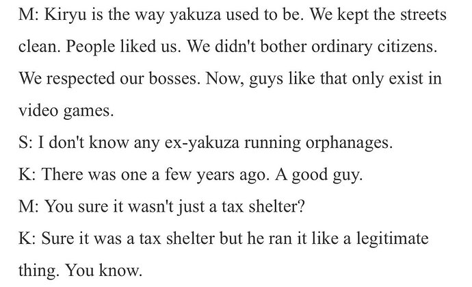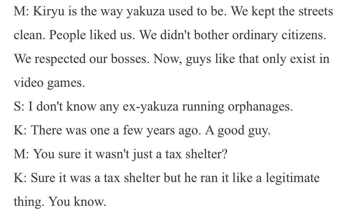 6 gave Kiryu his whole team of young yaks to learn the ways of the Dragon, so the party thing here seems like a natural evolution. My only surprise with 7 is that it isn’t one of them, honestly. There were at least two that were set up perfect for it.