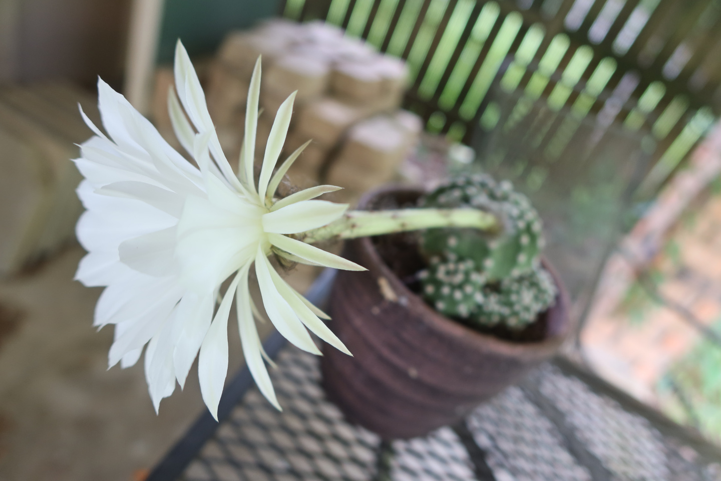The other day when I stepped outside to drive to work I saw that one of my little cactus plants had produced a surprisingly large flower on a long stalk. I’ve sometimes had little flowers suddenly appear on cactuses but nothing like this.