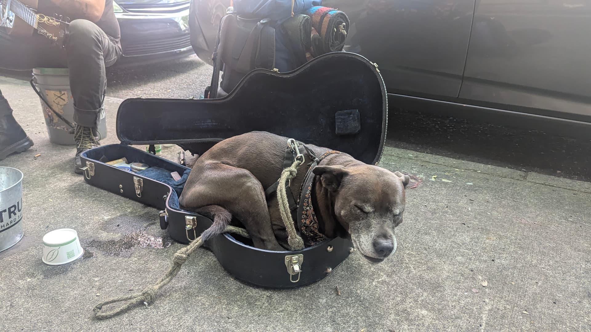 A fat dog (Bingo) often appears here. Does not bite people, but crowds people.