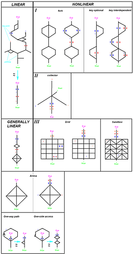 I) Fork maps generally include 2 or more alternative paths to keypoints (open or secret) which are significantly different from each other. This includes different ways to key/switch room, different ways to a key door, different paths with a same key color door at the end which lead to same area.