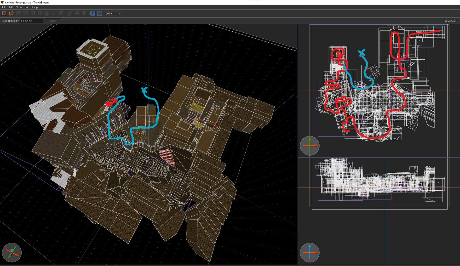 Here’s an image of the map as it is, with a red line indicating the built and playable critical path, and a blue line indicating how much is left to finish. Kind of hard to read this, I’m sure, but maybe you can get what I mean with how close I am.