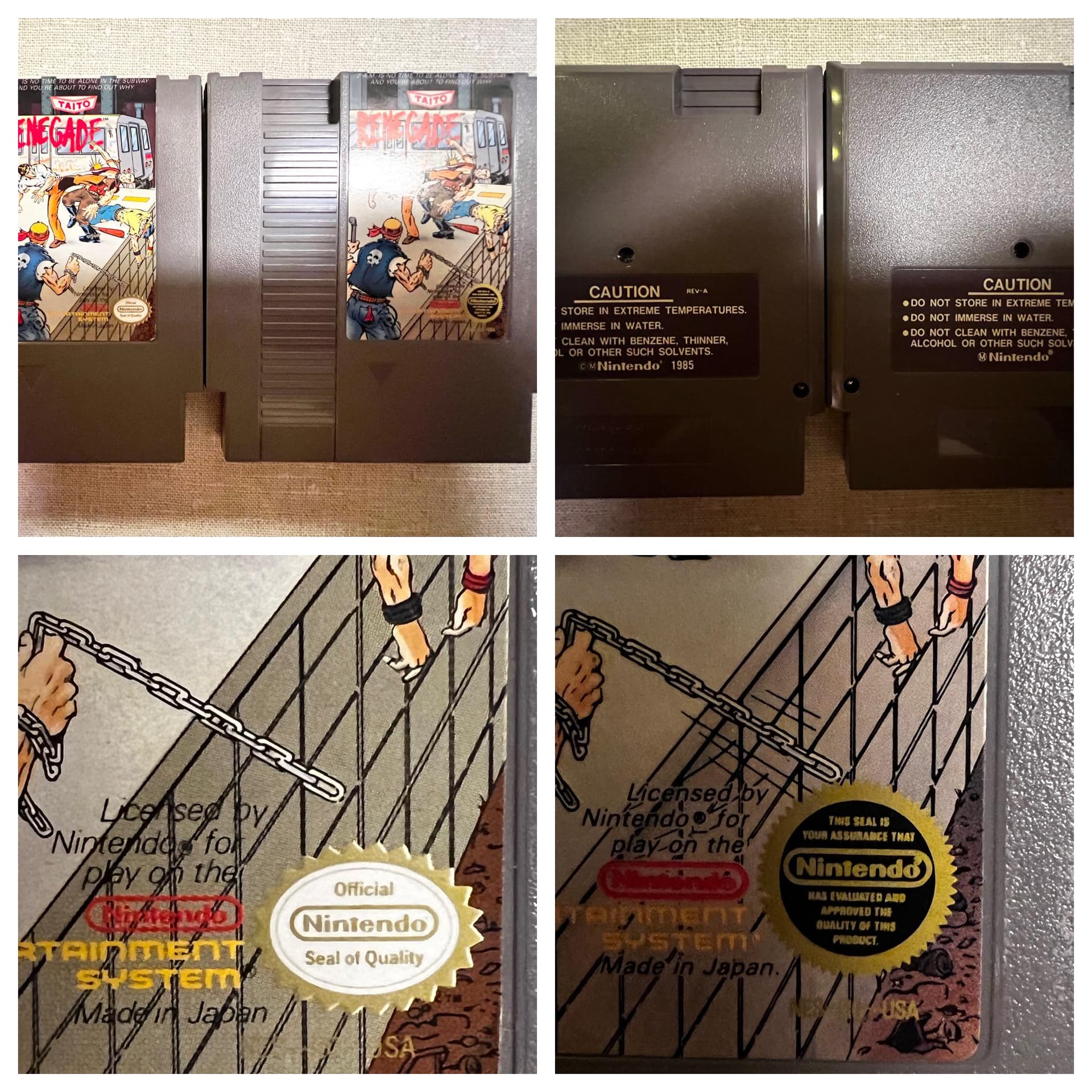 Differences between earlier black label and later white label versions of Renegade (NES): black label version has motion lines around the character’s chain, and debris on the ground below the platform–details omitted in the white label version.