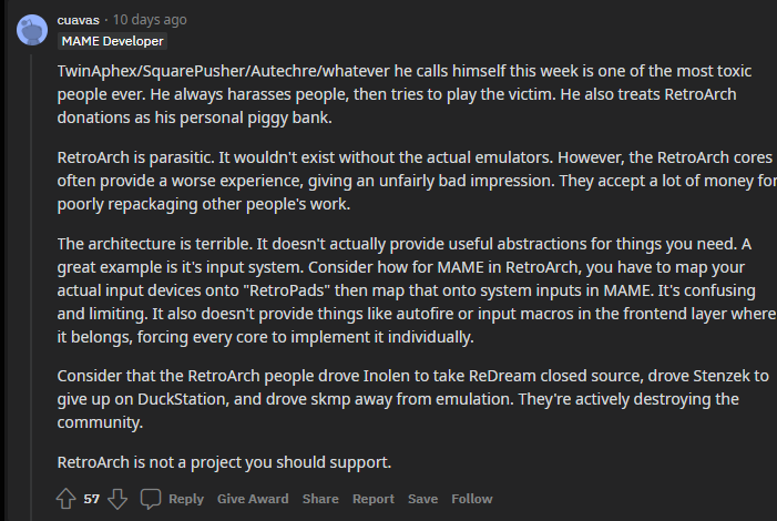 also mamedevs regularly shit talk retroarch on reddit, it is funny