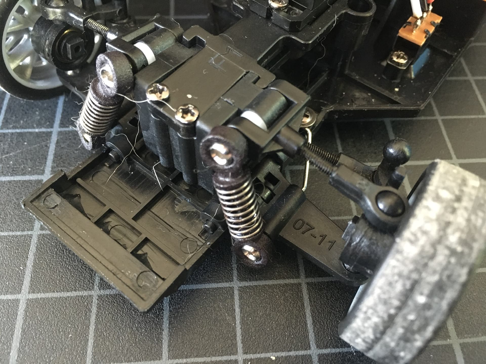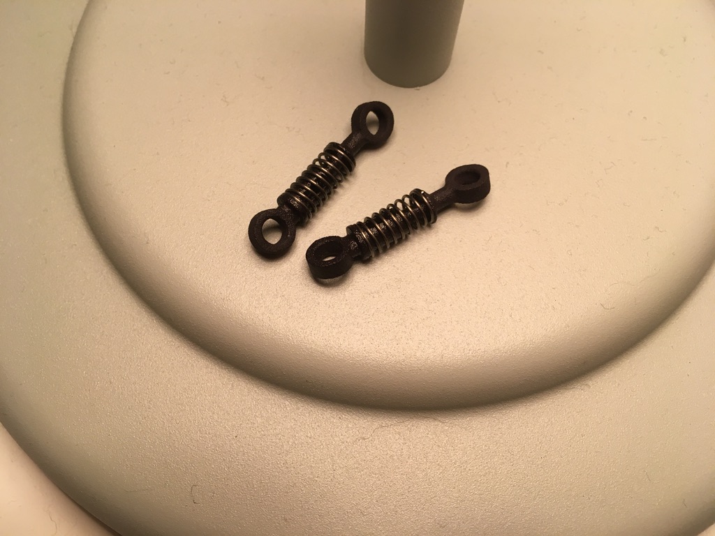 As shipped they use a simplistic bent-paperclip-esque torsion bar setup for suspension spring. At least on my car, even with some adjustment the little torsion bar doesn’t seem to quite be able to handle the weight at the rear. But, never fear: vendors on AliExpress also sell these cute little baby 3d-printed purpose-fit coilovers.