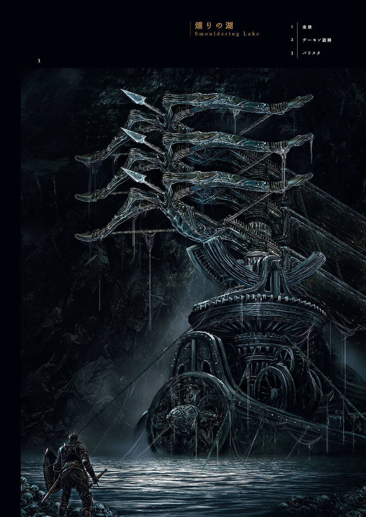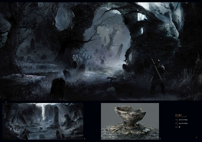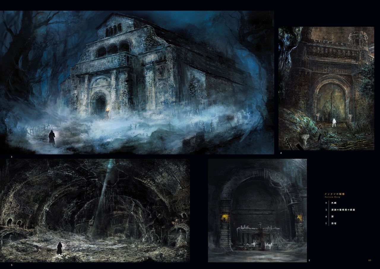 I think what’s most disappointing to me about the conceptual/actual split for Dark3’s locales is how richly dark the former look. Maybe there was a concern about legibility, or it clashed with the devs wanting to set most of the game during daytime. It can be forgotten how dark Demon’s Souls’ darkest parts are, and it’s a big part of that game’s environmental drama. Dark3’s darkest parts by comparison are a sort of blue-gray, and while that can work to its advantage in some spots, like when you view the high wall from Irithyll and the lighting makes it appear unreal, I think it generally flattens the game and makes some areas simply dull and inappropriately bright, like Farron keep. I also think that Dark Souls made an intelligent decision by switching up its ambient lighting between areas (a dramatic example is seeing how the colors and depth of darks change once you enter Blighttown from the depths), and think Dark3 could’ve done the same to make the catacombs look darker than, uh, any terranean site.
