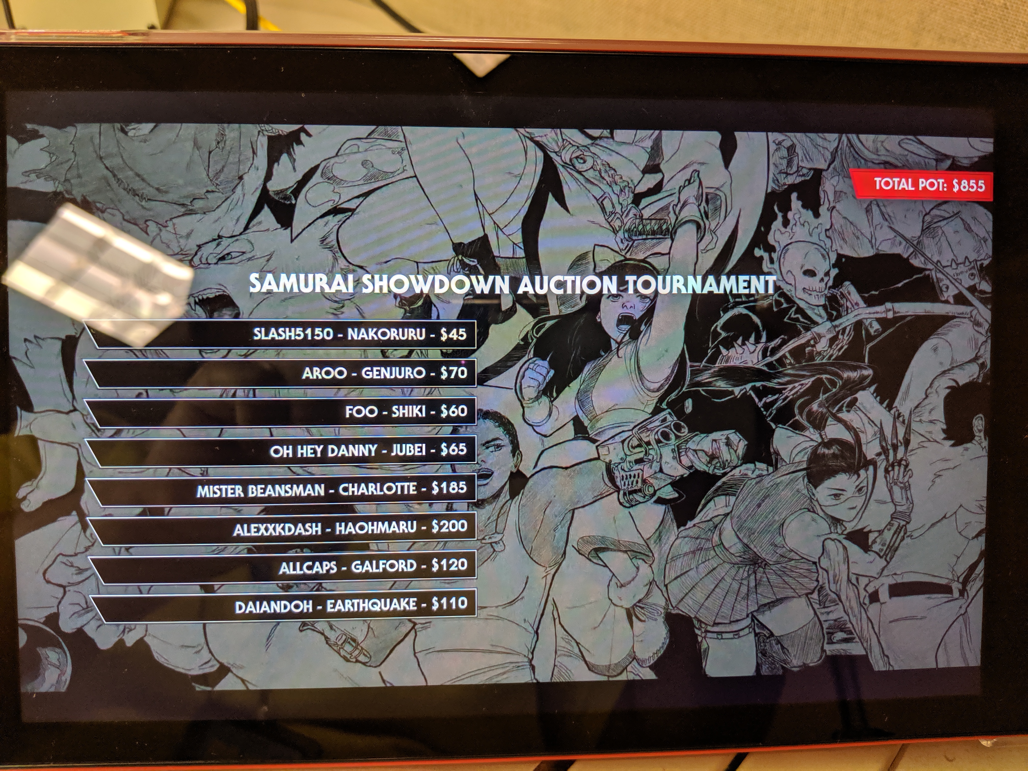 An 8 character pre-release version character auction tournament for SamSho 2019 got an $800+ pot