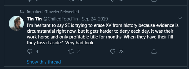 Also jumping onto his profile, I discovered that there are people who are on guard against Square-Enix’s apparent Final Fantasy XV erasure, which is really fucking funny to me.