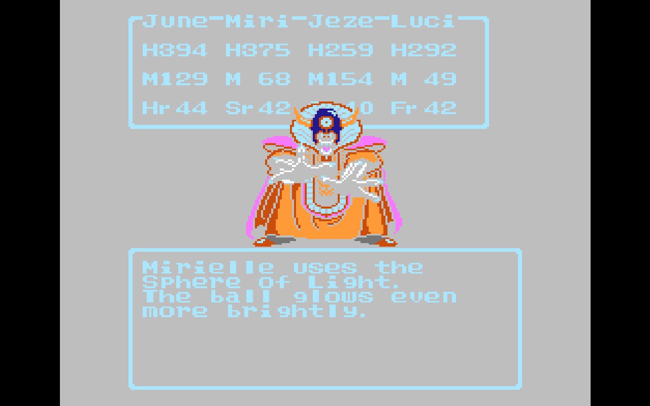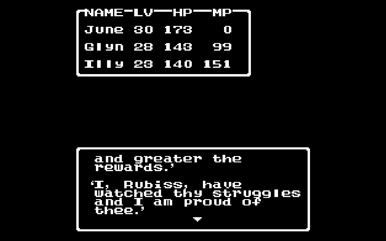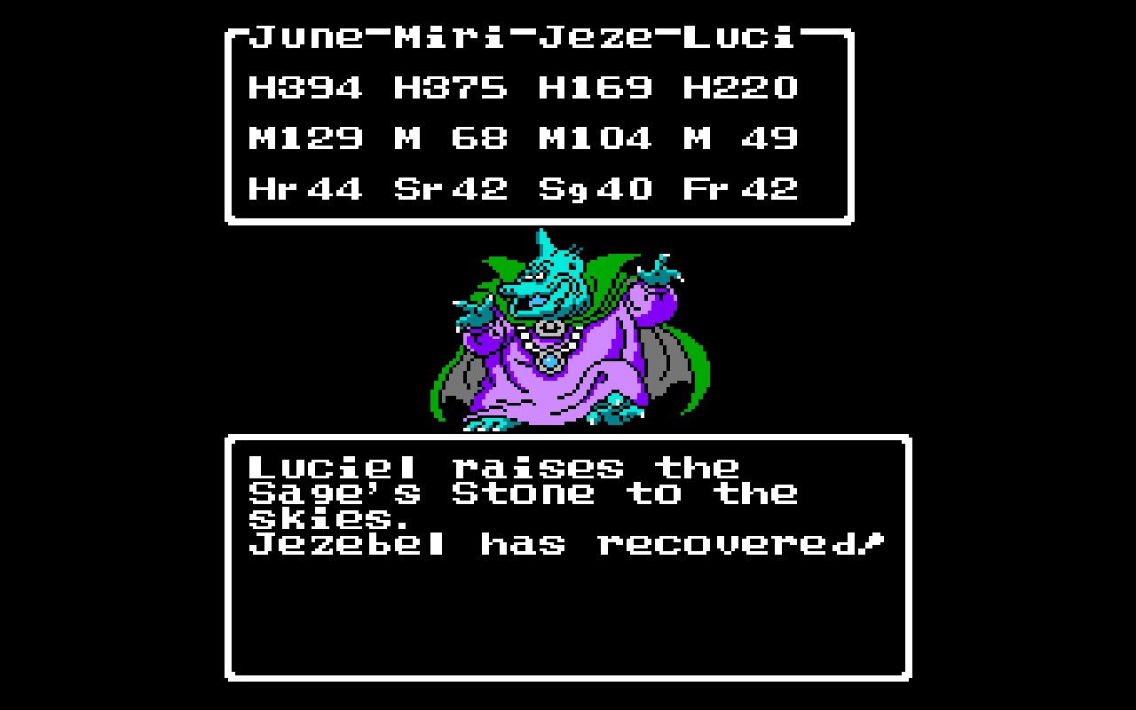 P.S. can we talk a lil bit about the Sage’s Stone. i both respect it and yet see it as a bit of an admission of guilt, that eventually Armor Project & co. realized that in order to keep ramping up the difficulty they’d basically need to hand you an unlimited use Healus/Multiheal. it’s shown up in every Dragon Quest game ive played since this one and im guessing it’s in the ones i haven’t played as well; my martial artist (the cat) was spamming it for most of the Zoma fight and ALL of the random battles leading up to him, just to tamp down our party’s MP use
