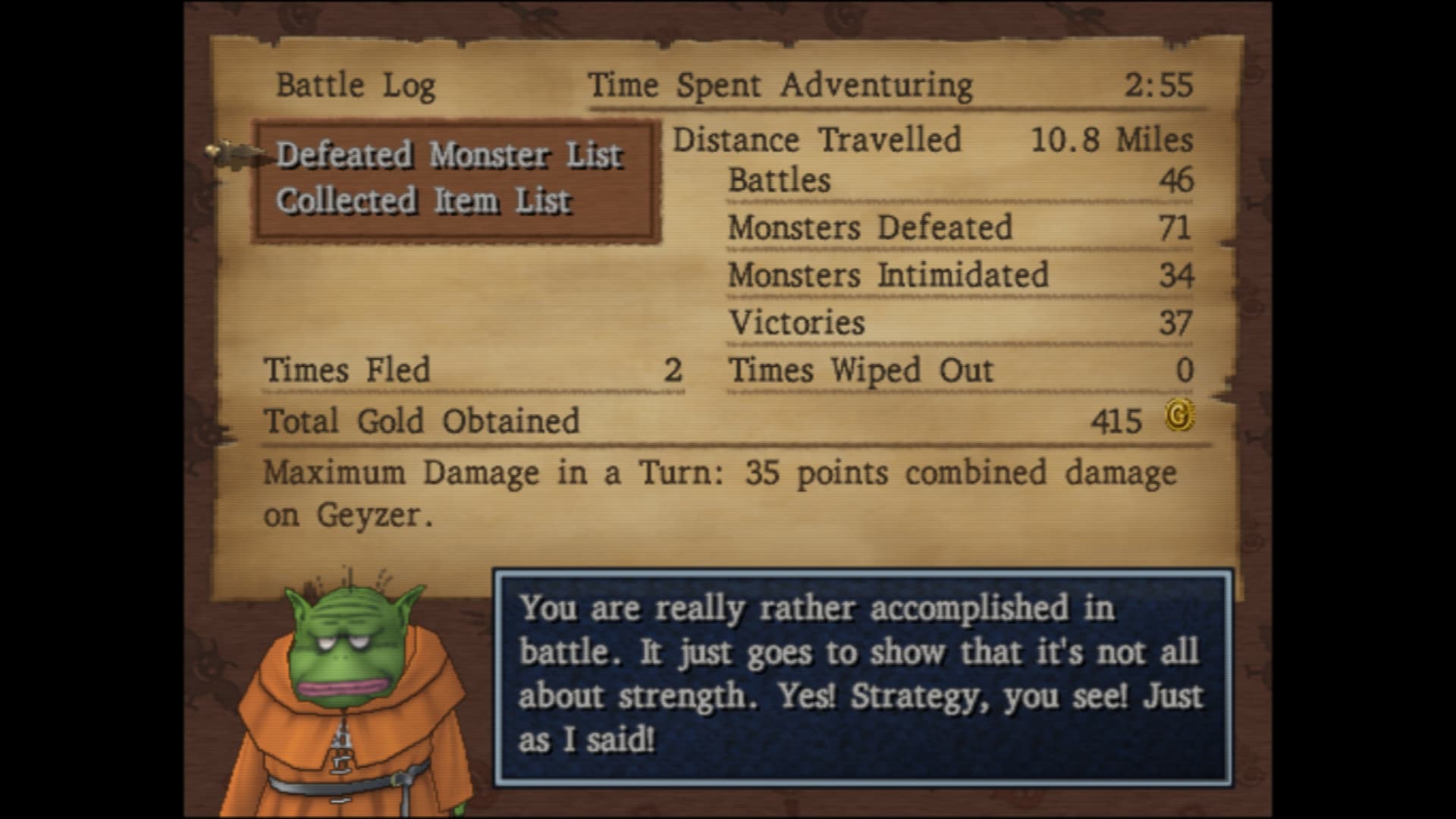 Dragon Quest Monsters is so invested in breeding that almost nothing else matters. Leveling up is secondary to combining two well-skilled killers together. I love the tree hub. I love the dialogue (as always). I love the easter eggs referencing battles from old games. I picked this game because I get to play as Terry from VI. If this was his childhood, I’m not sure how he turns into such an arrogant hero later on.