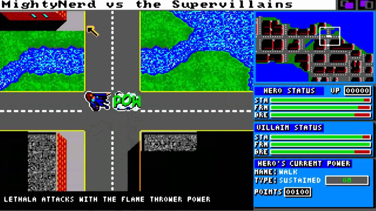 You make a superhero in some kind of very early D&D video game-style interface, as far as I can recall, then sort of stumble around a crush sorta Sim City type city and run into super-villains, then stuff happens in a very crummy sorta real-time way. I dunno. I remember being horribly disappointed, although I suppose I must have known what to expect based on the name. Basically bought it for the name. ^ _^