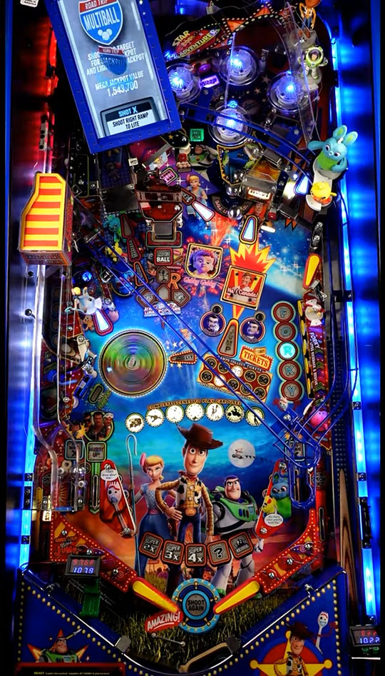 Yeah. Toy Story 4 is a Pat Lawlor table, and he certainly pushed the “how much stuff can you shove in a pinball table” thing back in the day with his Addams Family, Twilight Zone, and Safe Cracker tables for instance–but now he can have full color video running on them, too! And he loved it so much, he put a SECOND SCREEN actually ON THE TABLE ; D