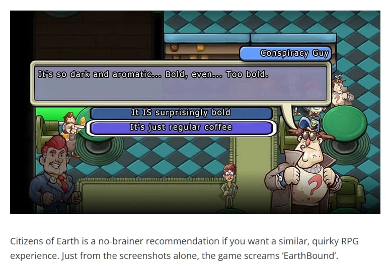 Pokemon. It’s very much a Mother with the edges rounded off and more kid-friendly, but still has its spirit. Probably doesn’t hurt that those games share(d) developers.