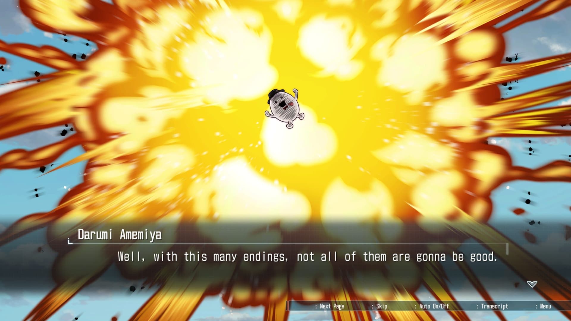 Feels like Hiroki Azuma’s Database Animal is key to understanding what kind of thing this is, especially that Azuma pointed at YU-NO as the ultimate postmodern database work, and Hundred Line pushes a lot of the same ideas further, reality mapped out as an endlessly branching, endlessly contradictory flowchart. And an all-you-can-eat otaku signifier buffet: here’s the dude with Shinji Ikari’s voice, here’s an ojou-sama with a stupid but memorable mask gimmick, here’s a cute mascot with murderous tendencies, here’s menhera girl who loves the same eroge as you do, here’s a completely perfunctiory Social Link system, and so on and so on. For better and worse, the game has everything you’d expect it to have in some form. The worldbuilding exists mostly to reveal itself as a complete sham, an endlessly layered fiction that’s mostly justifications for murder (and/or fun). Nothing exists except what you choose to believe in, except the parts of the database that personally interest you. There’s not even a true ending which surprised me, the game really wants to be whatever you want to be.
