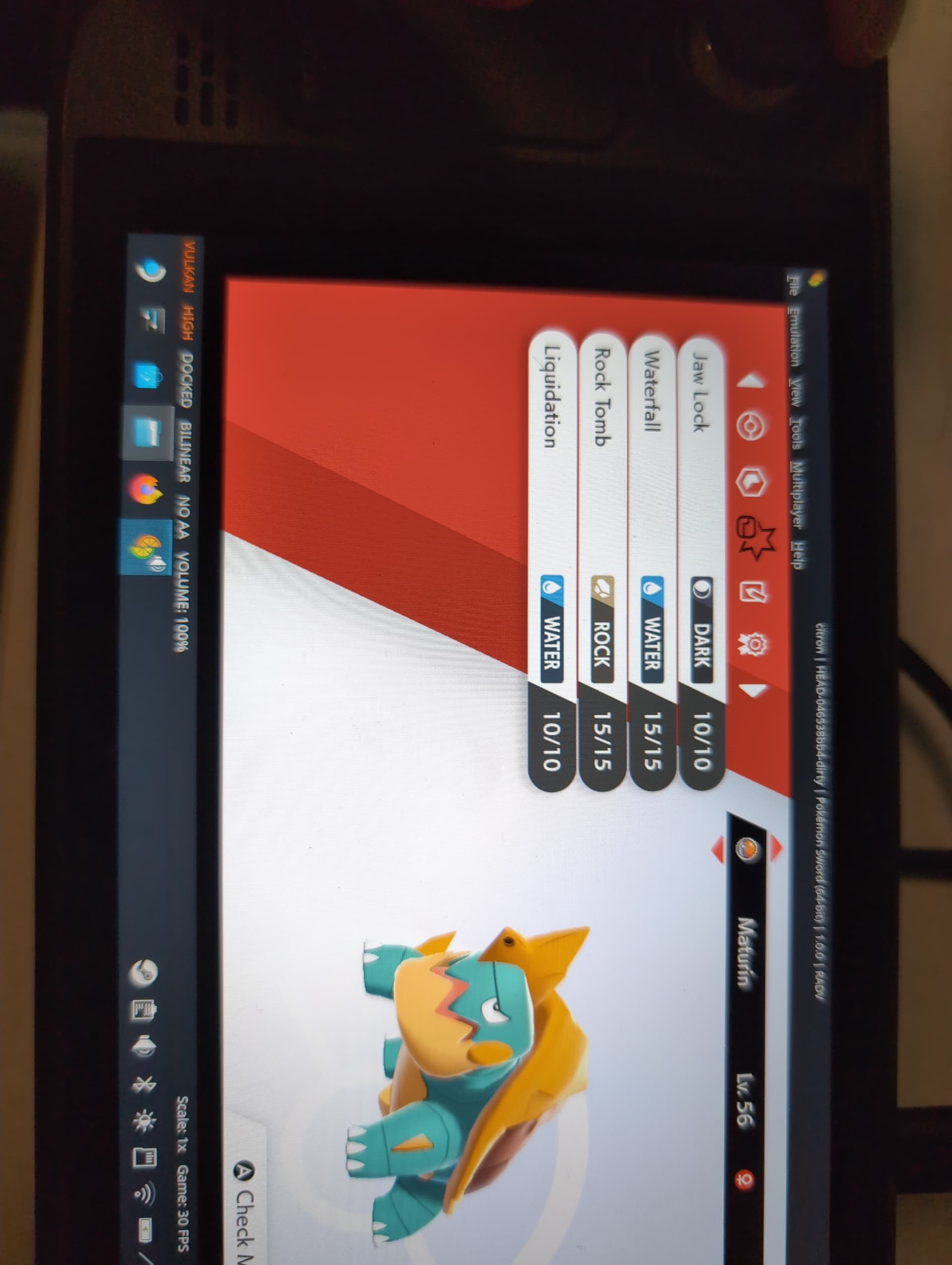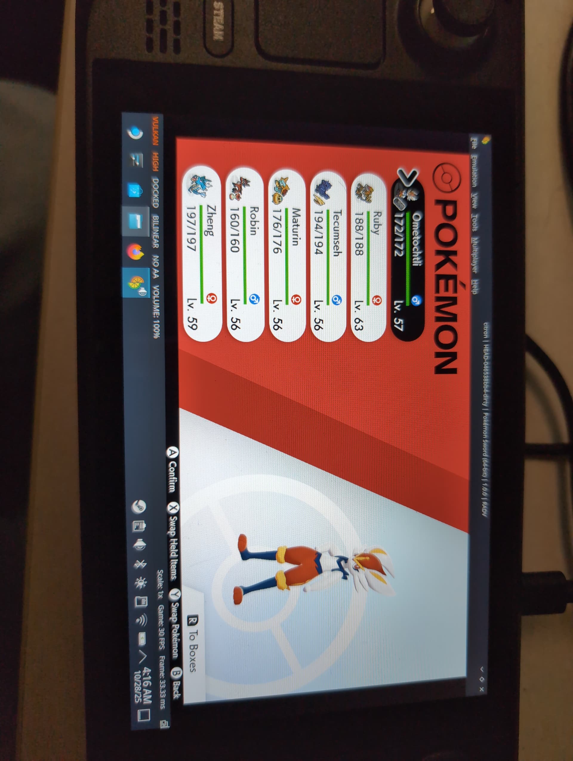 All eight gym badges at 15:38. Still haven’t lost a match yet, but this was the hardest. I used all my max revives, which is bad. Literally all of my pokemon had a critical weakness that allowed them to be one-shot and I got through by a combination of stupid AI, spamming heal items, priority moves, and a handful of my own critical hit moves. Having two dark type pokemon and a normal type pokemon is objectively the stupidest thing I’ve ever done in a game but I refuse to quit now, I want to go all the way with team trashfire.