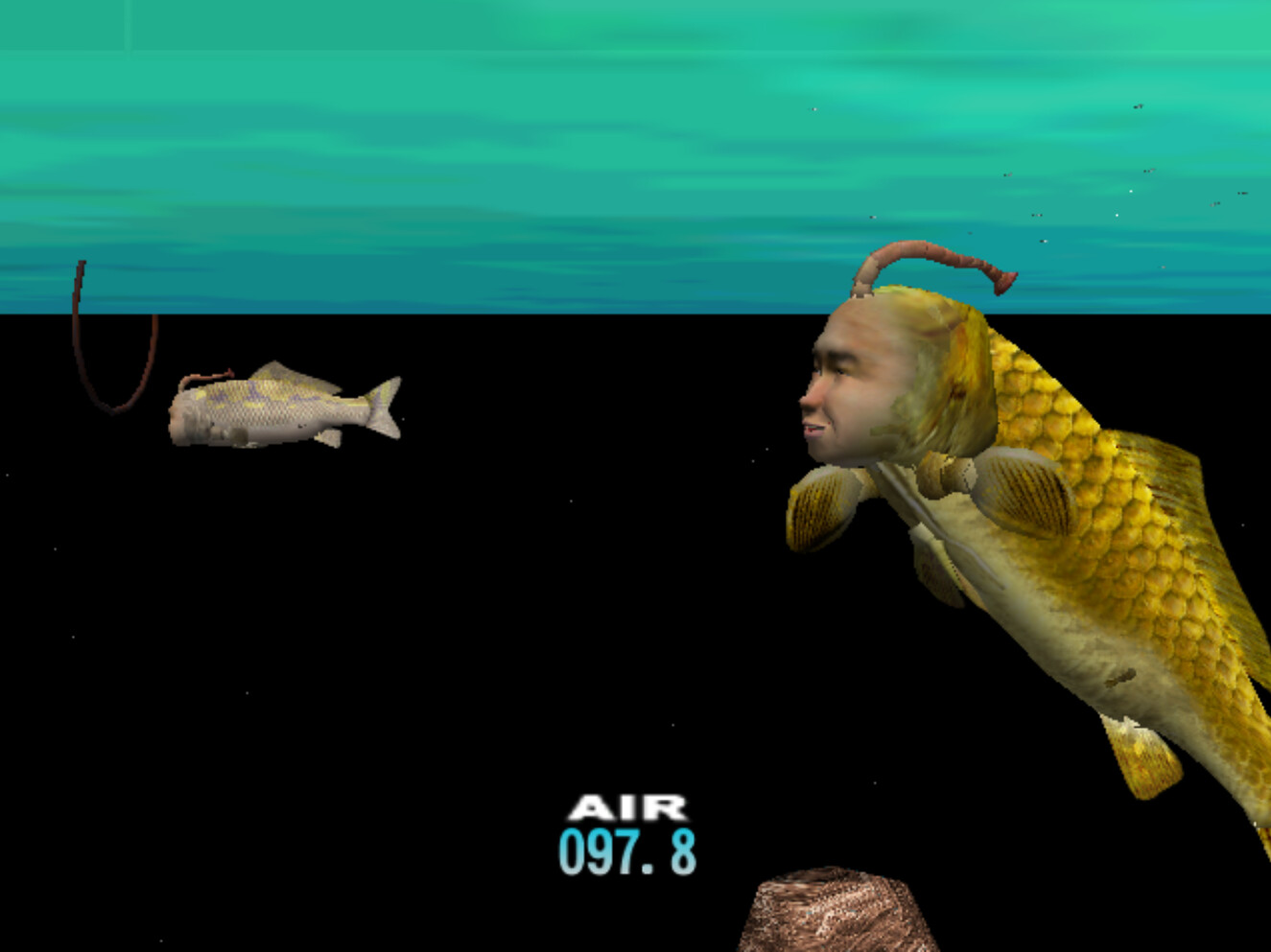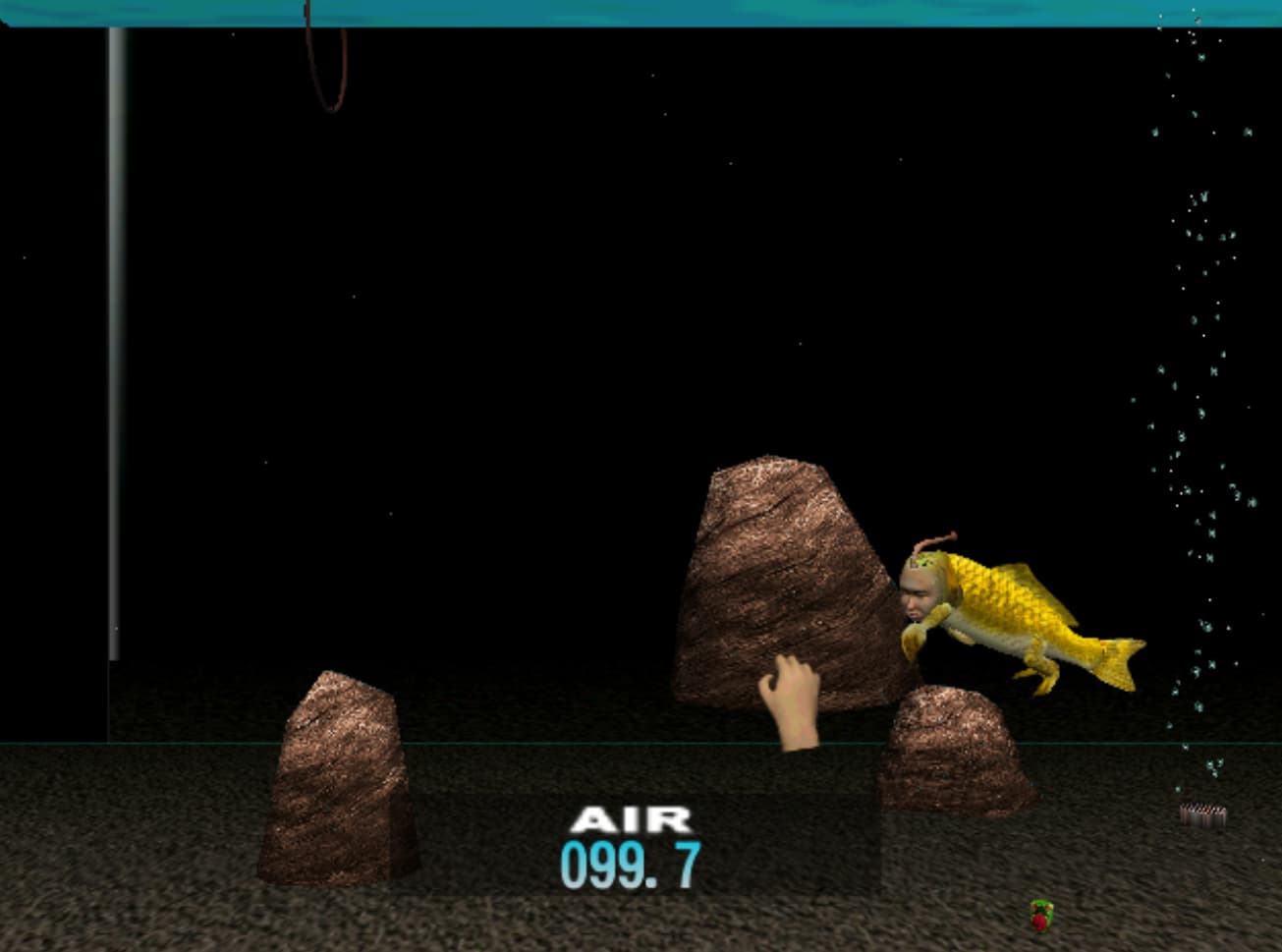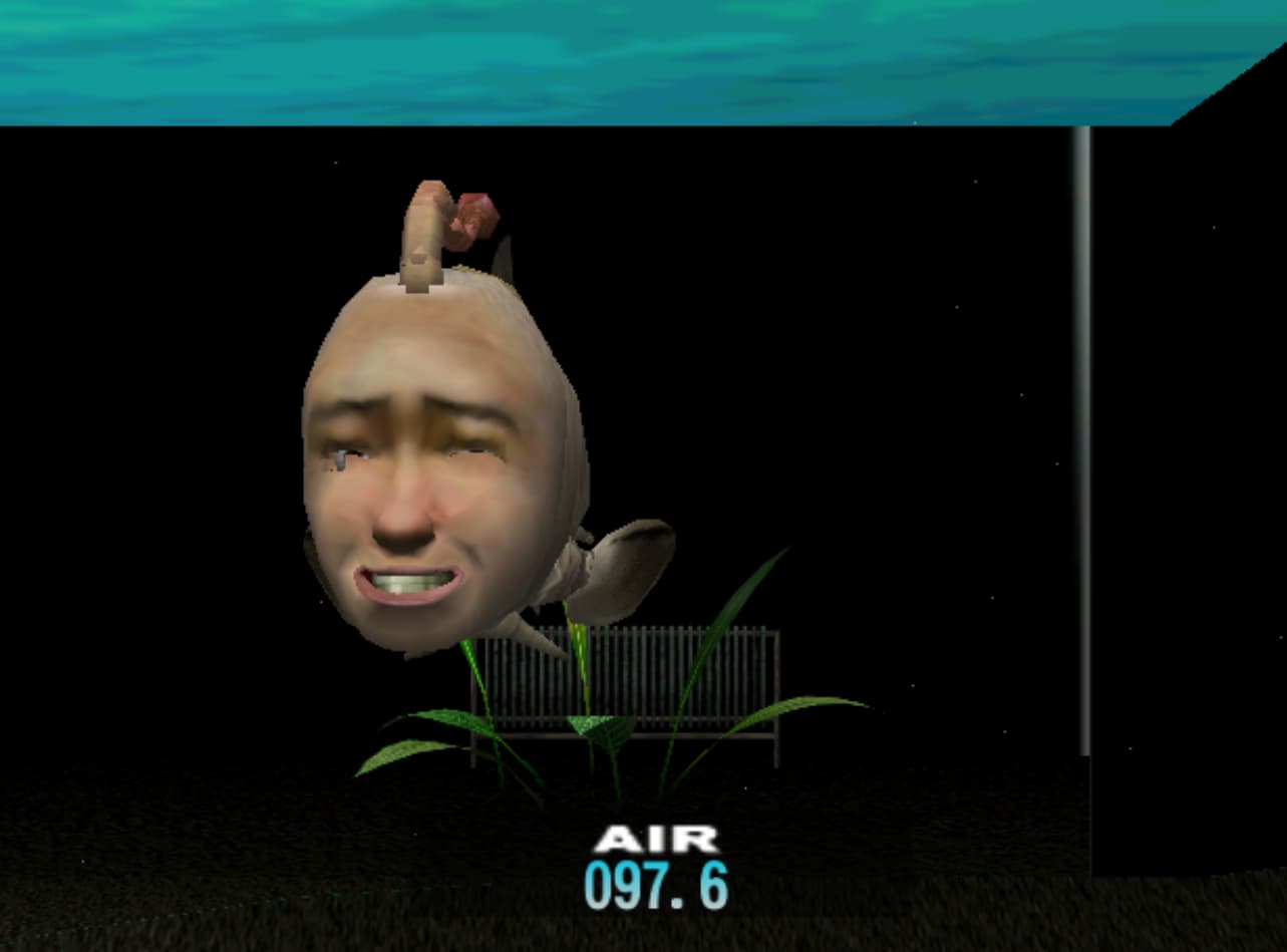taking pity on my dumb ass, seaman asked me an easy one today (“how many legs does an octopus have?”). it then played a scene where he pushed the rock again, which this time made most of the water drain out of the tank (?). seaman now lives inside a little puddle and is too busy flopping to get out to have much conversation.