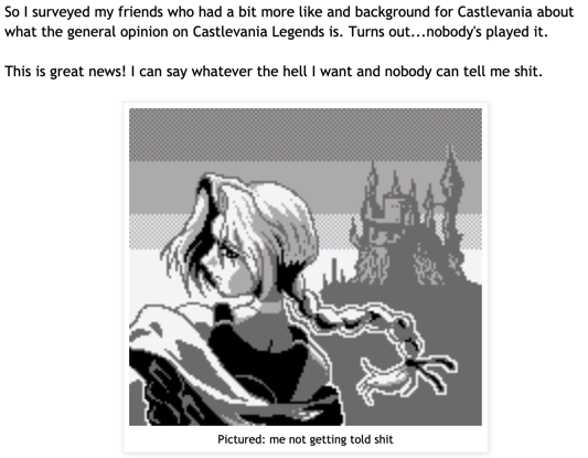 I also got real mad at IGA after reading about the development of this game, since he totally shits on Circle of the Moon. Which is a better game!! Like, if you’re going to shit on a game in the series you work on you have to do better than this.
