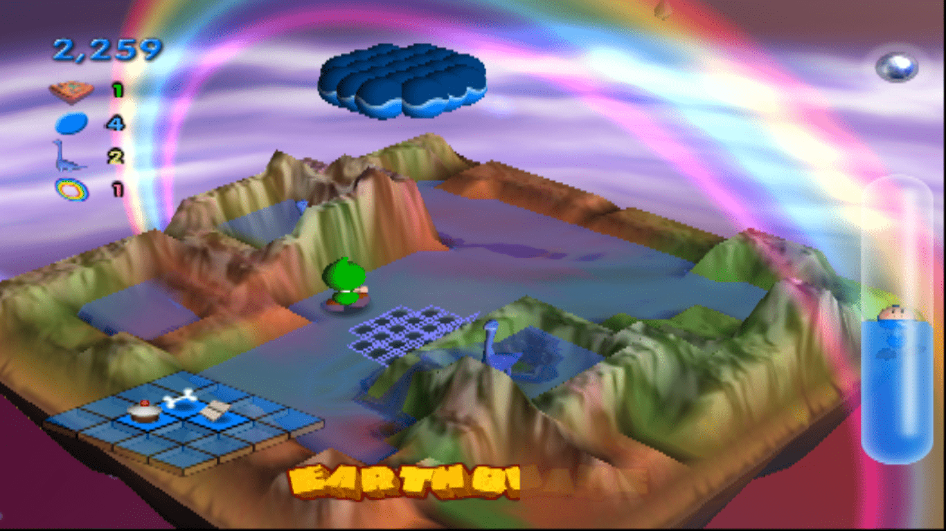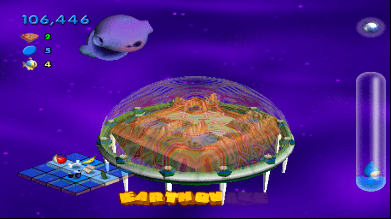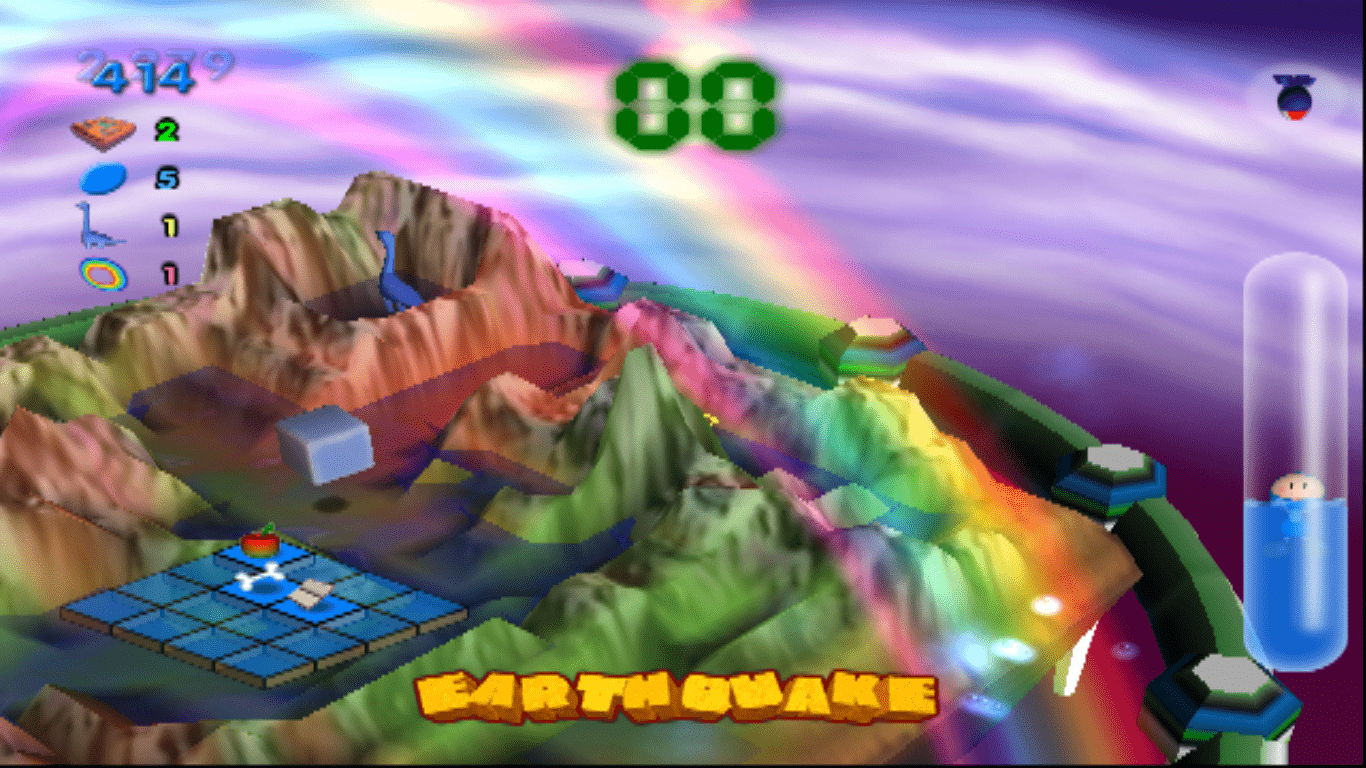 For a moment, I gave up. I downloaded the Windows version of Wetrix and played the game. I learned a terrifying truth: it’s not just the tutorial of Aqua Aqua that is difficult, it’s the whole game. A brutal onslaught of conditions rains down from the sky. Bombs poke holes in your platform, rain drips water everywhere, ice cubes freeze your lakes, and if you don’t manage your terrain well enough, you cause an earthquake. It wields the same chaotic energy of a Jeff Minter game while lifting some ideas from Populous. Did I mention that Aqua Aqua is our first English game in the series? Did I mention that the two brothers (?) who lead the development were also responsible for Plok?