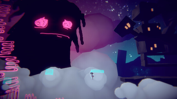 I finally got a run that went past this and… well that screenshot above is from it, the one where she is standing on the platform she often fell through. I wasn’t completely honest before, as that screenshot was a pic of her somehow getting her feet stuck in the floor and becoming unable to move. Those pink hands I pointed at to show the solid ground below her feet? Those aren’t a background element, those are the series of hands chasing me through this section that are designed to kill me if they catch either me or the blue orb. Clearly they have passed through me here without doing that, and as I waited for them to catch my blue orb so we could both die and try again they passed through it as well. I paused for a second, sighed and decided to move the orb through a bit of the above maze section so it can bump into one of those tall shadow creatures you can barely make out in that pic and I can then have the sweet release of death. I bumped into it and I did not die, however at that moment the ground gave out and the little girl went falling into the pit except now here as well it refused to kill her, her just falling forever as the game struggled to keep up. I pressed pause, returned to the title screen and quit the game forever.