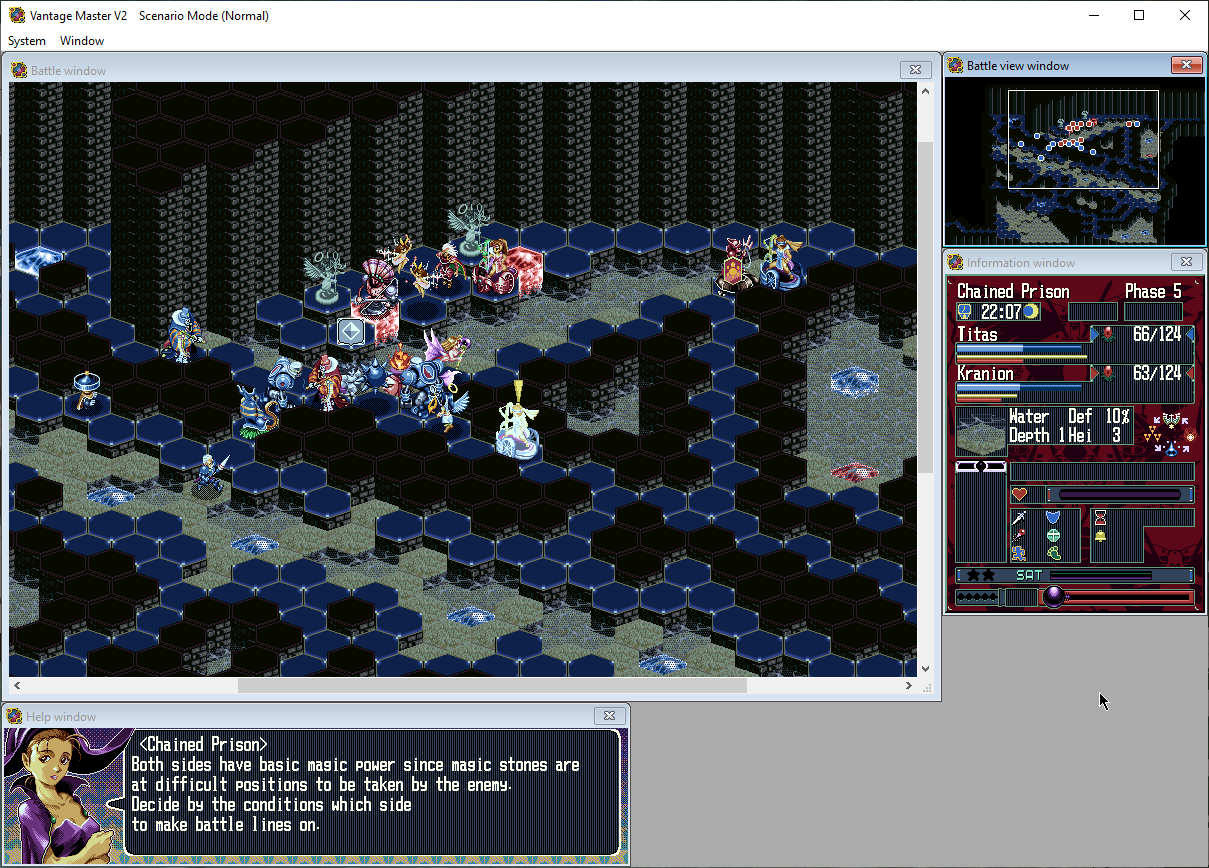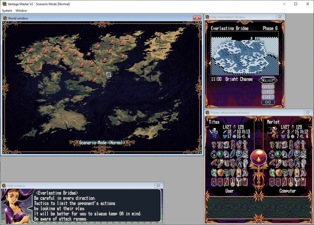 I wish I had taken a screenshot of this stage like 5 turns later, where the enemy Master (pictured here between the two Fifenall statues) dug into the tiny chokepoint room with 2 guaranteed mana stones and just kept summoning healer natials over and over to spend as much time not losing as it could. It was probably the most shameless and ignoble Iāve ever felt a video game AI being.