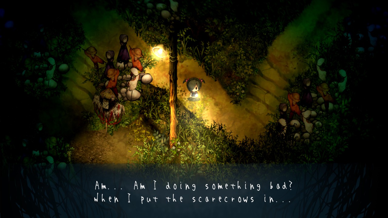 so in yomawari 3, a curse is taking your memories away so you need to go around town finding items you feel a connection to then exploring the places they remind you of, in whichever order you want. i could’ve gone to the school or a mysterious locked tunnel so of course i went tunnel, which led me to needing to explore the rice field next to it for the key. got attacked by spirits, but gained protection from scarecrows as long as i kept helping them out, unwittingly getting caught up in what seems like some kinda spirit turf war. unsure if i’m even doing the right thing as the scarecrows seem to be using their power to mess up the protective monuments of some baby spirits