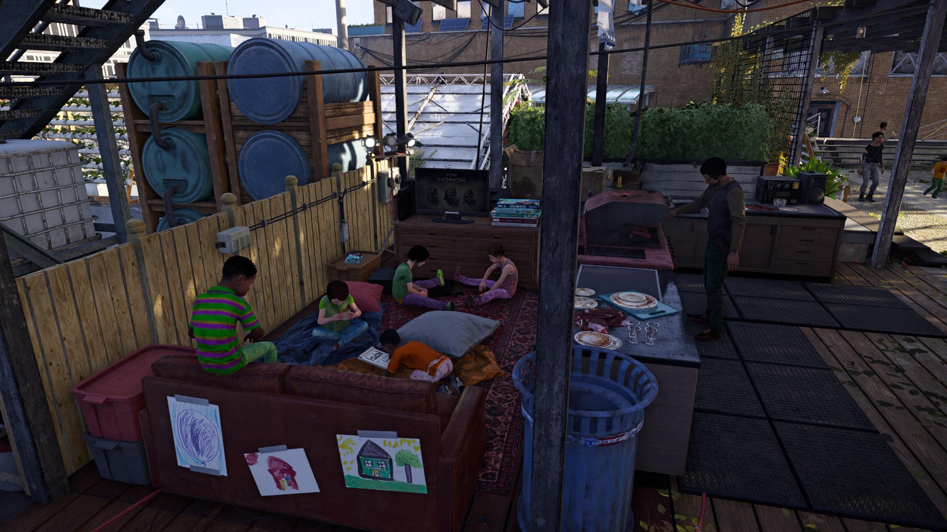 by clearing missions (killing thousands of ethnically diverse gang members) you upgrade the settlement to get a barbecue and solar panels and a game center so that the kids can play Ubisoft games but they choose not to because they’re in one
